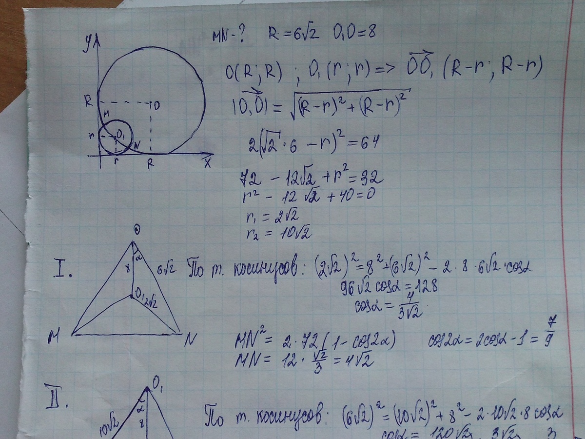 окружность радиуса 6 корней из 2 вписана в прямой угол. вторая окружность также вписана в этот угол и пересекается с первой в точках M и N. известно, что расстояние между центрами окружностей равно 8. найти MN. ...
