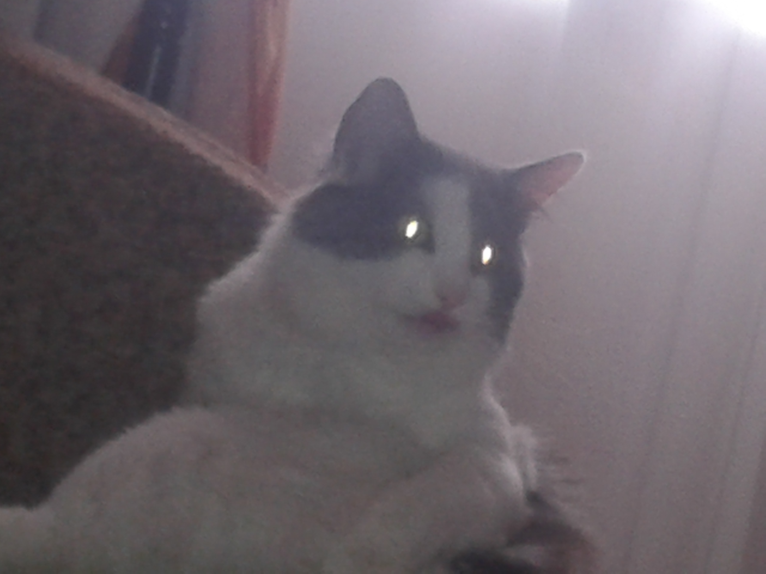 ему очень нравится когда я его глажу. окрас у него чёрно- белый. он очень любопытный,милый и пушистый. я люблю своего кота!