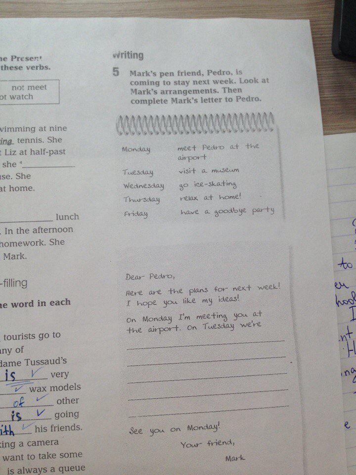 On Tuesday we are visiting a museum. On Wednesday we are going ice-skating. On Thursday we are relaxing at home. On Friday we are having a goodbye party.