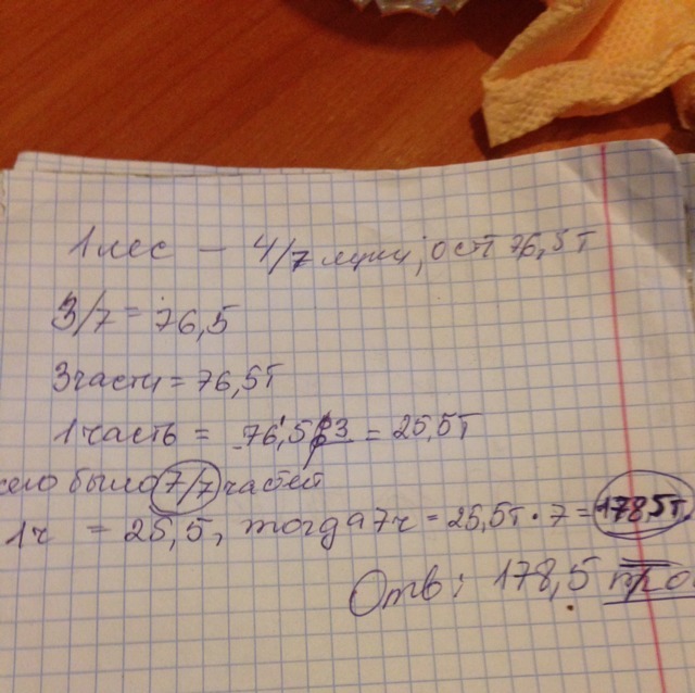 Вот, если 4части из 7 забрали, осталось ещё томи эти три части были равны 76,5т, значит делим 76,5:3=25,5 это одна часть. Всего получается было семь частей, умножаем 25,5•7=178,5 т, вот и ответ