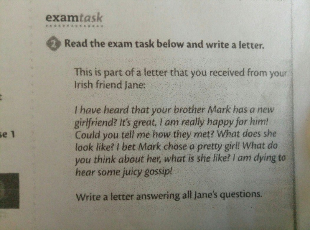 I didn’t know that you are so curious. You are right. My brother has a new girlfriend. Her name is Irina. She is the same age as he is. They met in a café near his University. She is pretty. She has white hear and very big blue eyes. She is slim. She is very clever. She reads a lot. She wears beautifully. She is good at computers. I don’t know her well, but I think she is kind, positive and very active. They are happy. They meet almost every day.