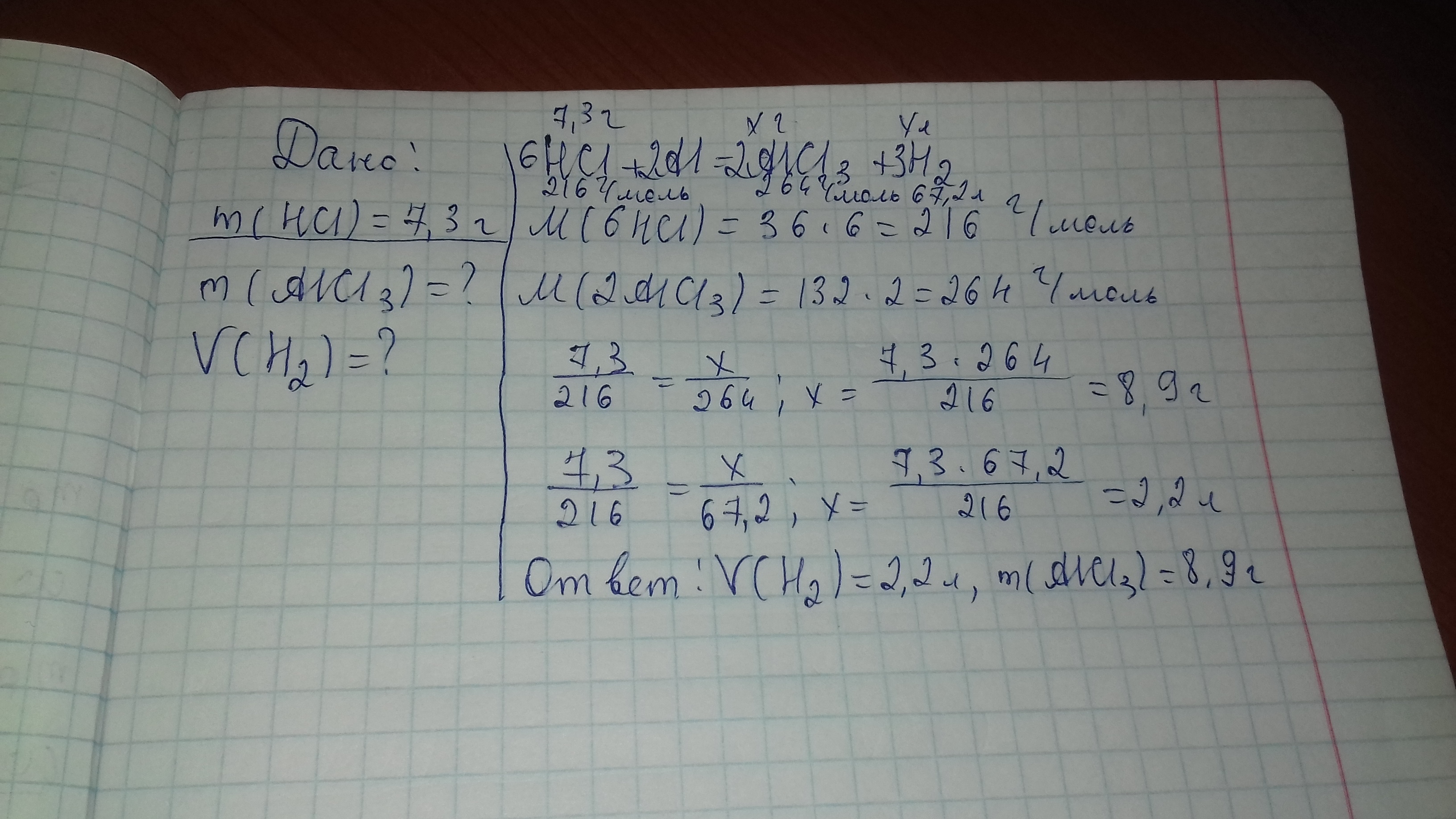 Рассчитайте AlCl3 какой массы образуется в результате химической реакции избытка алюминия с хлоравадароднай кислотой массой 7.3 г. Водород какой химической количестве выделится при этом?