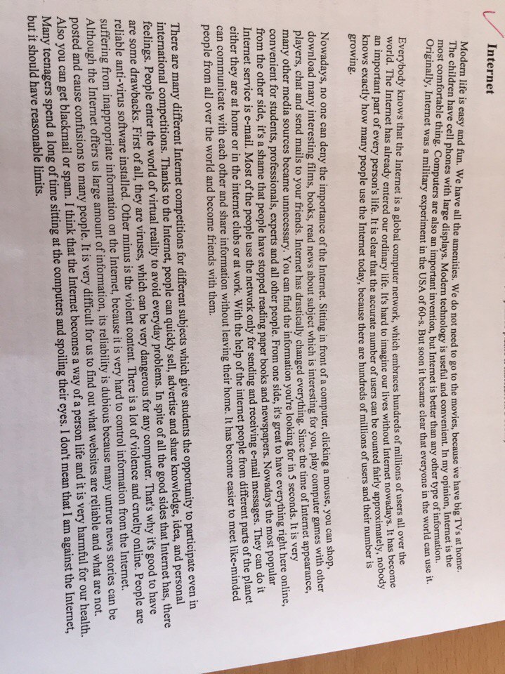 Современная жизнь легко и весело. У нас есть все удобства. Нам не нужно идти в кино, потому что у нас есть большие телевизоры на дому. У детей есть сотовые телефоны с большими дисплеями. Современные технологии-это полезно и удобно. На мой взгляд, Интернет-это самая удобная вещь. Компьютеры также являются важным изобретением, но Интернет лучше, чем любой другой тип информации. Изначально Интернет был военным экспериментом в США 60-х годов. Но вскоре выяснилось, что все в мире могут его использовать.Всем известно, что Интернет-это глобальная компьютерная сеть, которая охватывает сотни миллионов пользователей во всем мире. Интернет уже вошел в нашу обычную жизнь. Трудно представить нашу жизнь без Интернета в наше время. Он стало важной частью жизни каждого человека. Понятно, что точное количество пользователей можно пересчитать довольно приблизительно, никто не знает точно, сколько людей используют Интернет сегодня, потому что есть сотни миллионов пользователей и их количество растет.Сегодня никто не может отрицать важность Интернета. Сидя перед компьютером, щелкая мышкой, вы можете совершать покупки, скачать много интересных фильмов, книг, читать новости о теме, которая тебе интересна, играть в компьютерные игры с другими игроками, общаться в чате и отправлять письма своим друзьям. Интернет кардинально изменил все. С момента появления Интернета, многие другие источники СМИ стали ненужными. Вы можете найти информацию, которую вы ищете за 5 секунд. Это очень удобно для студентов, специалистов, экспертов и всех остальных людей. С одной стороны, это здорово иметь все прямо здесь онлайн, с другой стороны, обидно, что люди перестали читать бумажные книги и газеты. В настоящее время самым популярным сервисом Internet-Электронная почта. Большинство людей используют сеть только для отправки и получения сообщений электронной почты. Они могут сделать это либо они у себя дома или в интернет-клубах или на работе. С помощью интернета люди с разных концов планеты могут связываться друг с другом и обмениваться информацией, не покидая своего дома. Она стала легче встретить единомышленников со всего мира и подружиться с ними.Есть много различных интернет-конкурсах по различным предметам, которые дают студентам возможность принять участие даже в международных конкурсах. Благодаря Интернету, люди могут быстро продавать, рекламировать и делиться знаниями, идеей, и личные чувства. Люди входят в мир виртуальной реальности, чтобы избежать повседневных проблем. Несмотря на все хорошие стороны, интернет, есть и некоторые недостатки. Во-первых, они вирусы, которые могут быть очень опасны для любого компьютера. Вот почему хорошо быть установлена надежная антивирусная программа. Другой минус-это насильственное содержание. Есть много насилия и жестокости в интернете. Люди страдают от нежелательной информации в Интернете, потому что это очень трудно контролировать информацию из Интернета. Хотя Интернет дает нам большой объем информации, ее достоверность сомнительна, потому что многие не правдивые новости могут быть опубликованы и причиной путаницы для многих людей. Это очень трудно для нас, чтобы выяснить, какие сайты являются надежными, а какие нет. Также вы можете получить шантажом или спам. Я думаю, что Интернет становится образом жизни человека, а эт