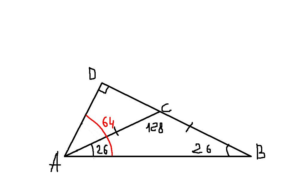 Теперь треугольник ABC.так как АС=СВ то углы А и В равны.т.е по 26 градусов. тогда угол С=180-26*2=128градусов.