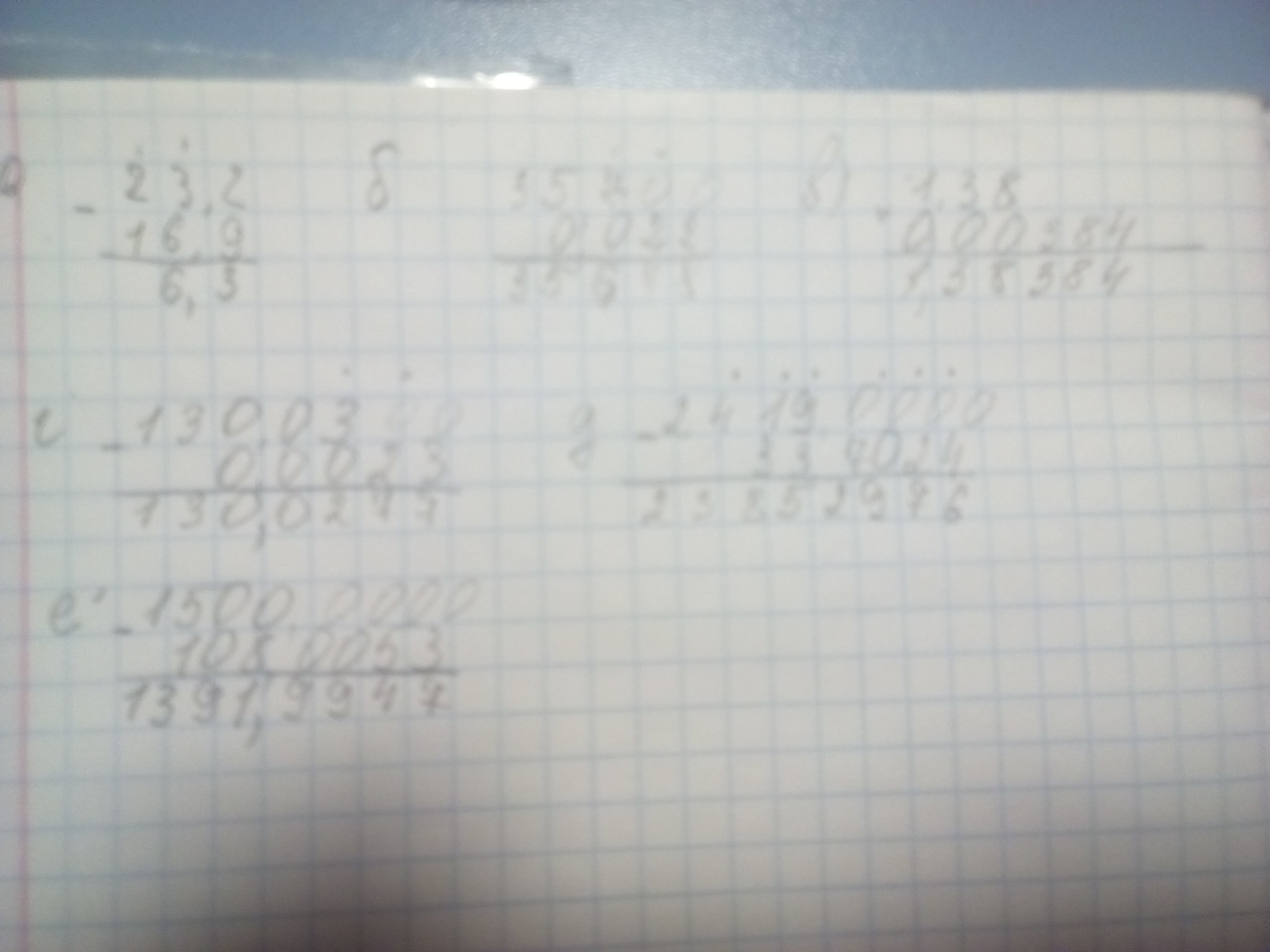 выполните действия столбиком:а)23,2-16,9,б)35,7-0,022,в)1,38+0,00384,г) 130,03-0,0023,д) 2419-33,7024,е) 1500-108,0053