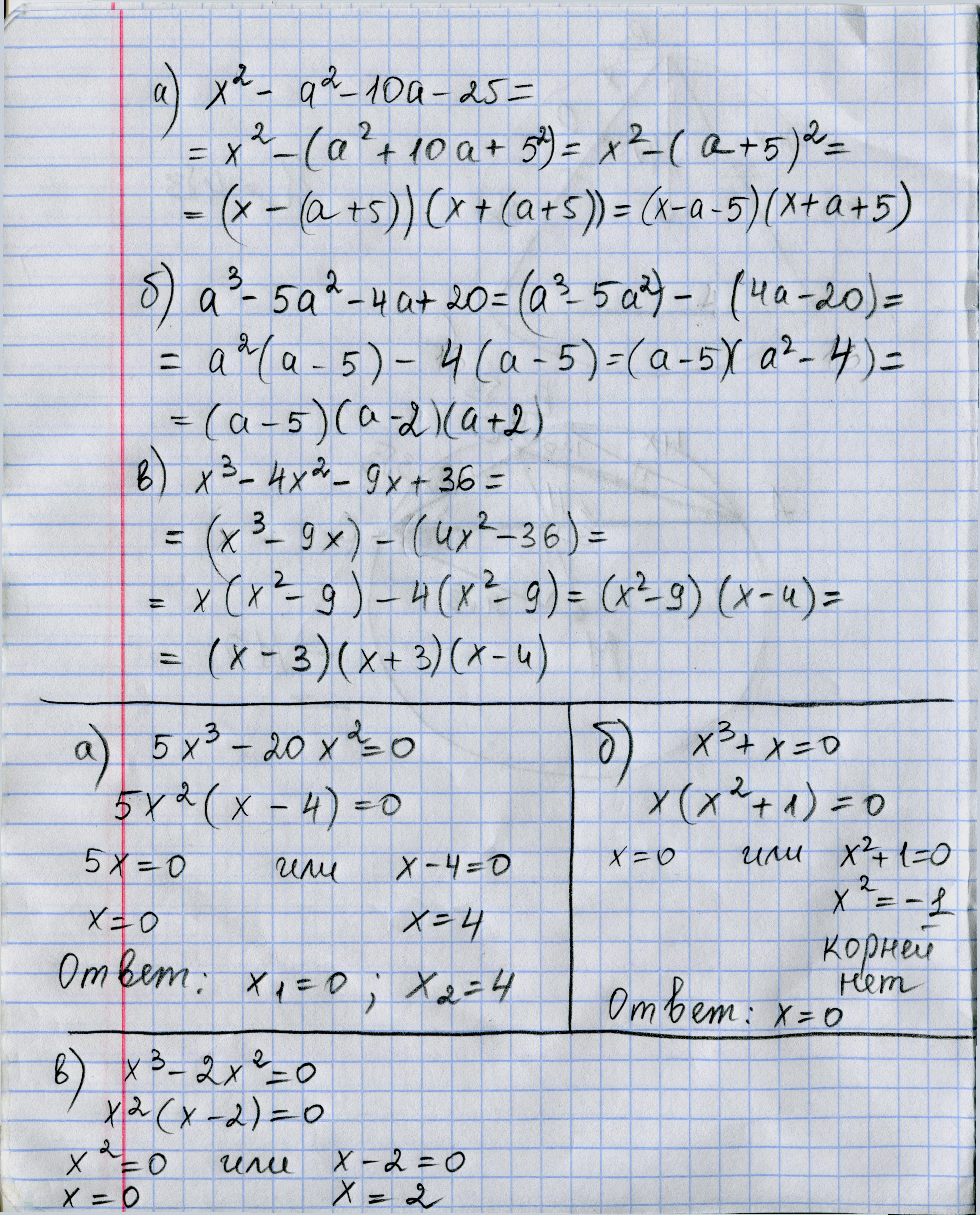 вот тут =(а^3-5a^2)-(4a-20) = a^2(a-5)-4(a-5) = (a-5)(a^2-4) = (a-5)(a-2)(a+2)