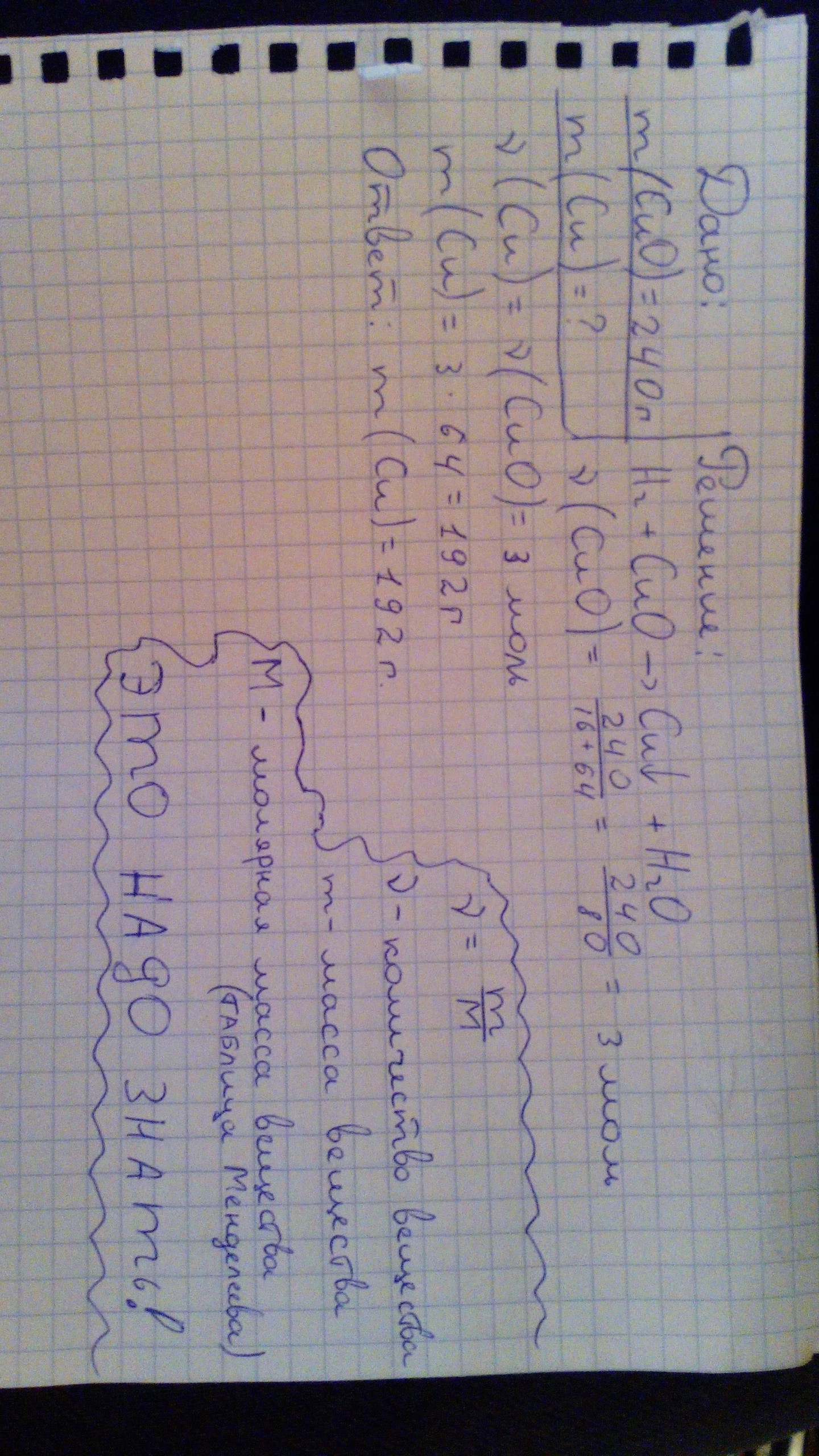 Какая масса меди образуется при взаимодействии водорода с 240 г оксида меди(||)