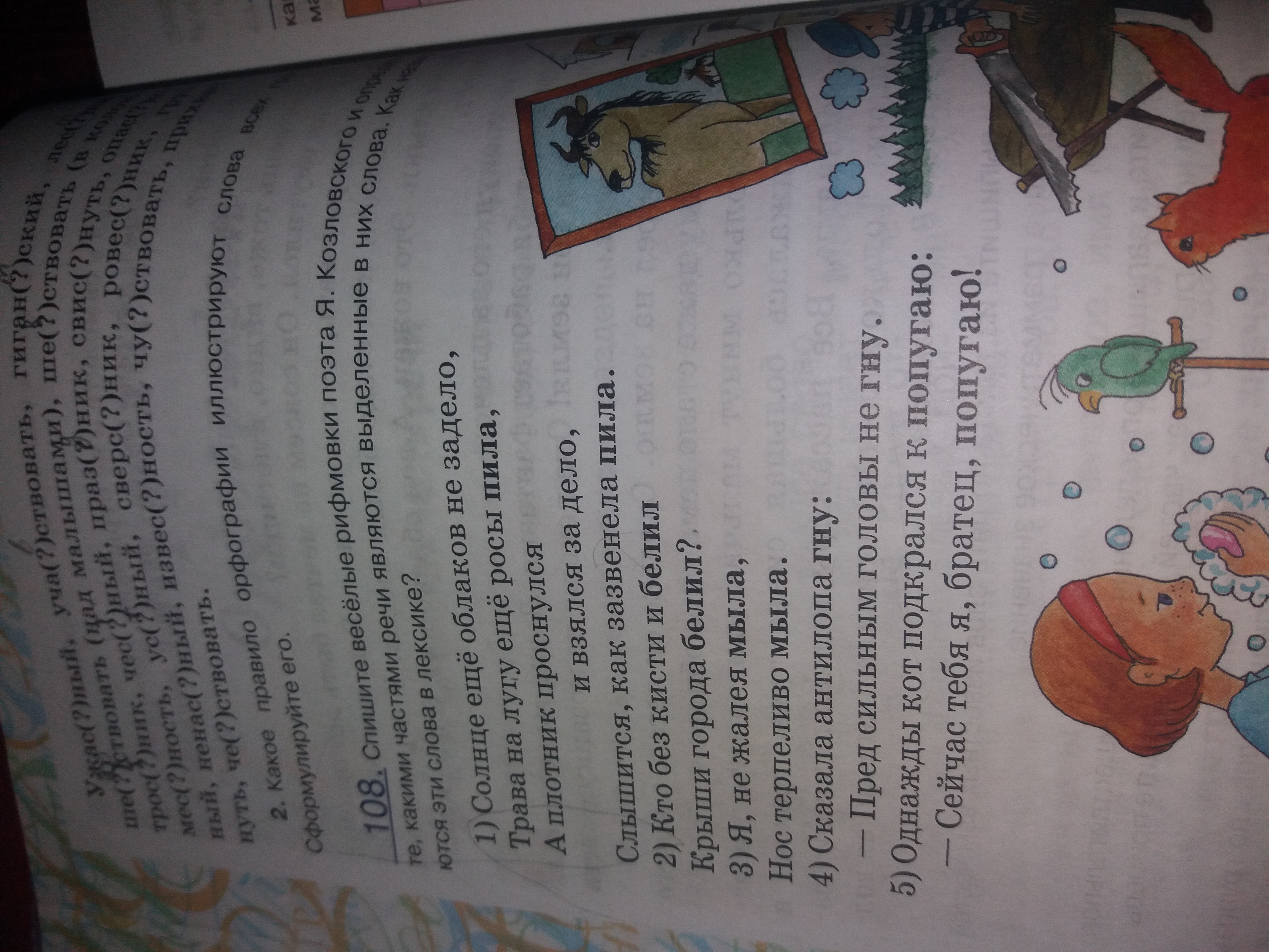 Номер 108 спишите весёлые рифмовки поэта Козловского и определите, какими частями речи являютсч выделинные в них слова.Как называются эти словав лексике? Помогите,а то я не понимаю