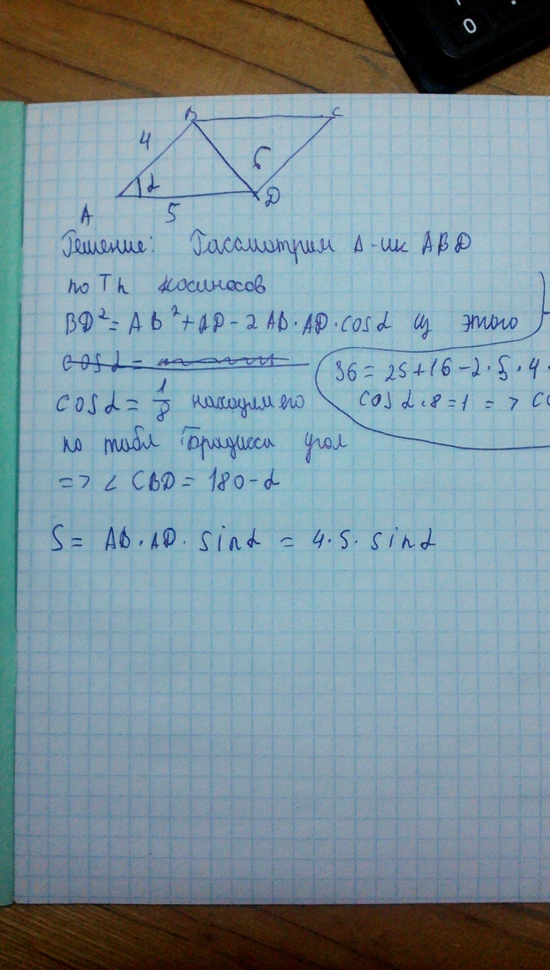В параллелограмме ABCD стороны AB=4 , AD=5 , BD=6.Найти угол CBD и площадь параллелограмма.