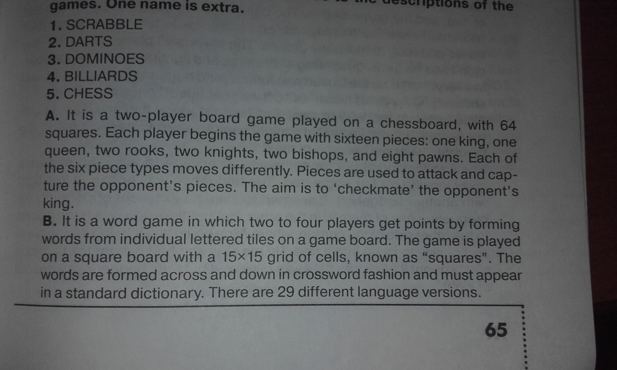 В. Это словарная игра в которой два или четыре игрока набирают очки при помощи формирования слов из отдельных фишек с буквами на игральной доске. Игра (играется :D) происходит на квадратной доске с ячейками 15х15, которые называются квадратами. Слова составляются по горизонтали и вертикали в стиле кроссворда и должны находиться в стандартном словаре. Существует 29 языковых разновидностей.