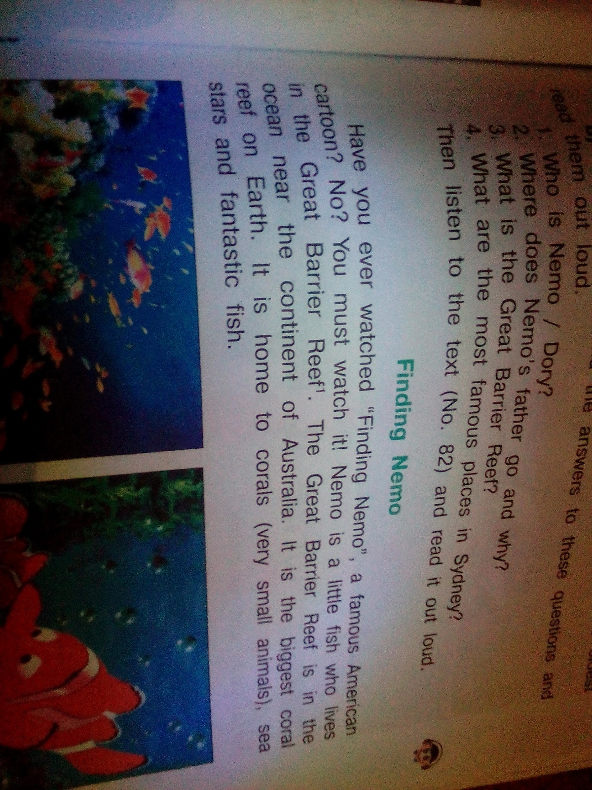 Вы когда-нибудь смотрели "В поисках Немо", знаменитый американский мультфильм? Нет? Вы должны посмотреть это! Немо - маленькая рыбка, которая живёт на Великом Барьерном Рифе. Великий Барьерный Риф находится в океане неподалёку от континента Австралия. Это самый большой коралловый риф на Земле. Это дом кораллов (очень маленьких животных), морских звёзд и фантастических рыб.