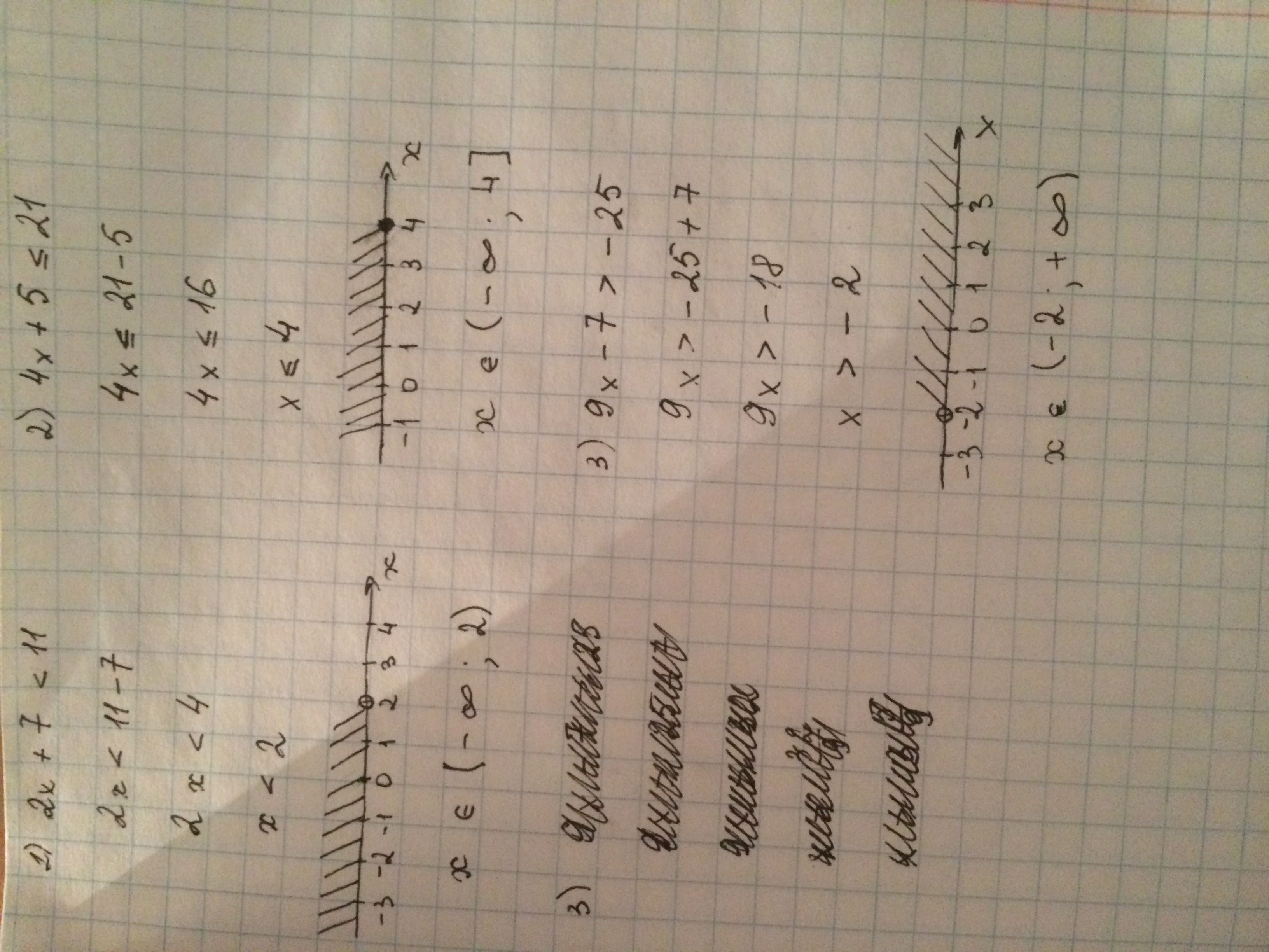 Решите неравенство и изобразите множество его решений на координатной прямой 2x+7<11 4x+5≤21 9x-7.-25