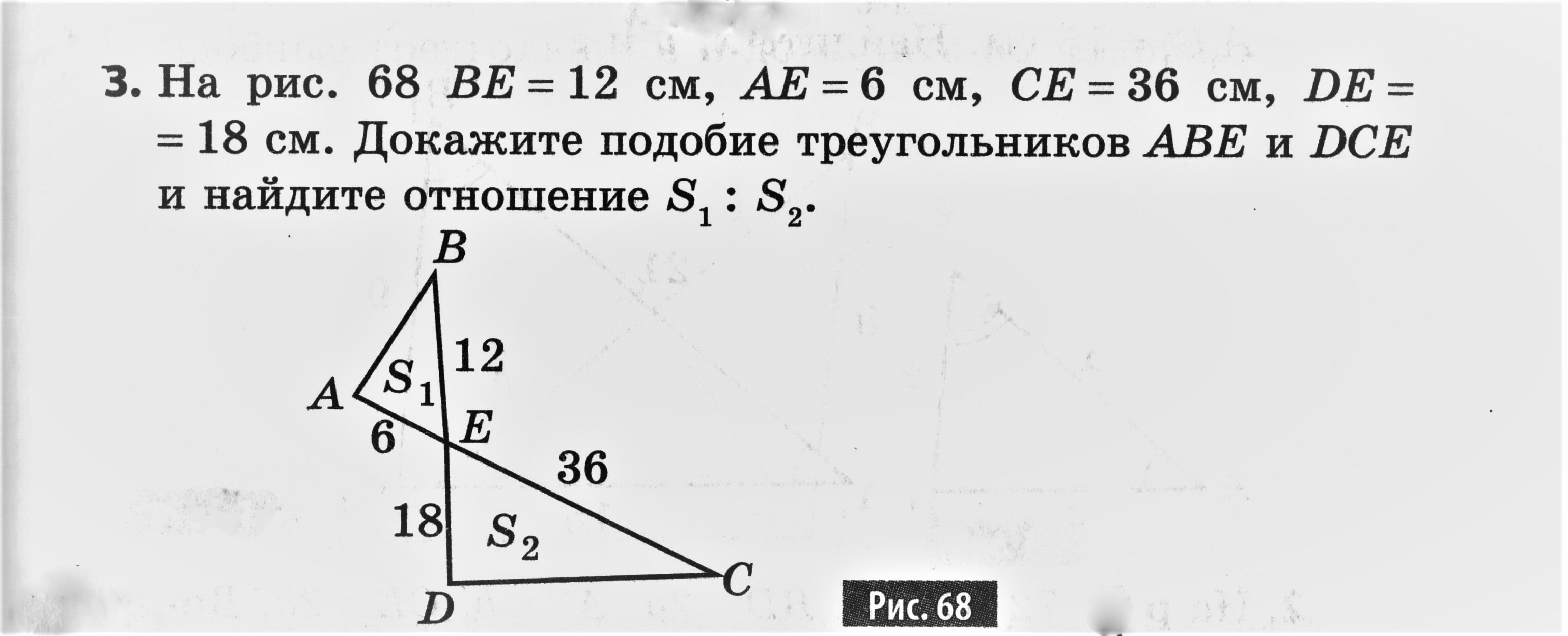 На рис. 68 BE=12см, AE=6, CE=2, DE=18. Докажите подобие треугольников ABE и DCE и найти отношение S₁:S₂.