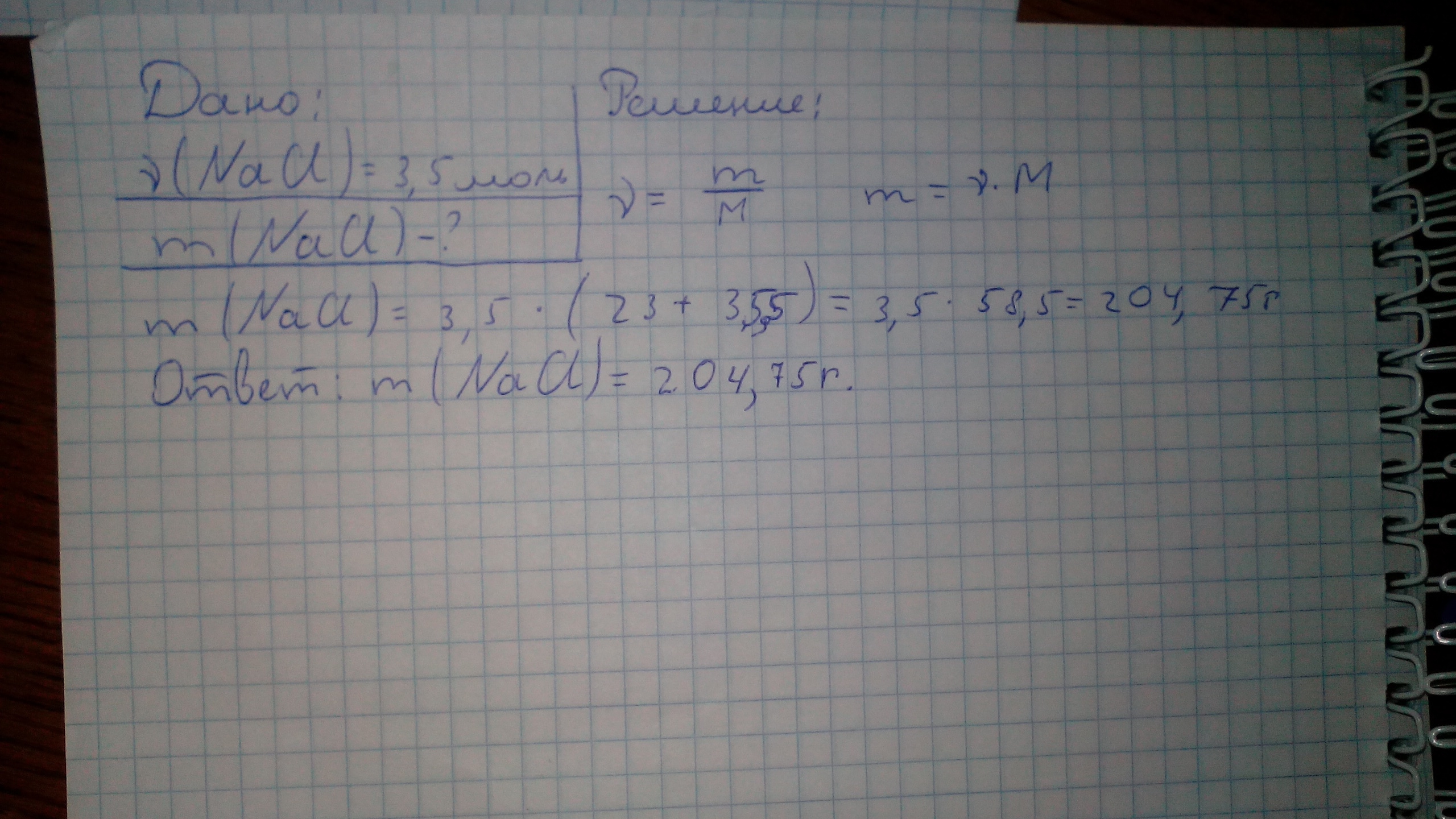 вычеслить массу и количество вещества 3 с половиной моль хлорида натрия