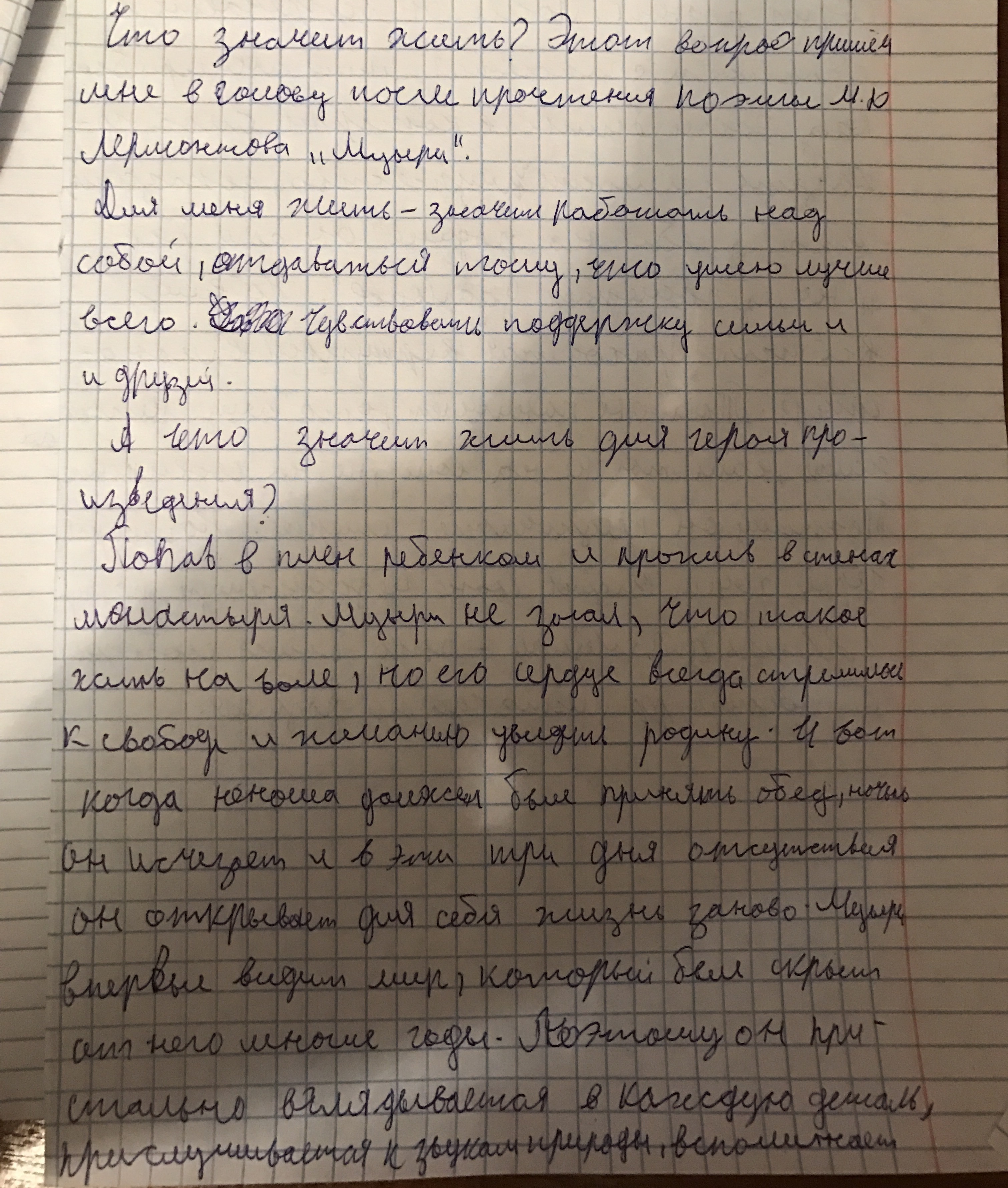 ПОМОГИТЕЕЕ ПРОШУ ЭТО МОЕ СОЧИНЕНИЕ ПО ТЕМЕ ЧТО ЗНАЧИТЬ ЖИТЬ ДЛЯ МЦЫРИ ПРОВЕРЬТЕ НА ОШИБКИ И ЗАПЯТЫЕ