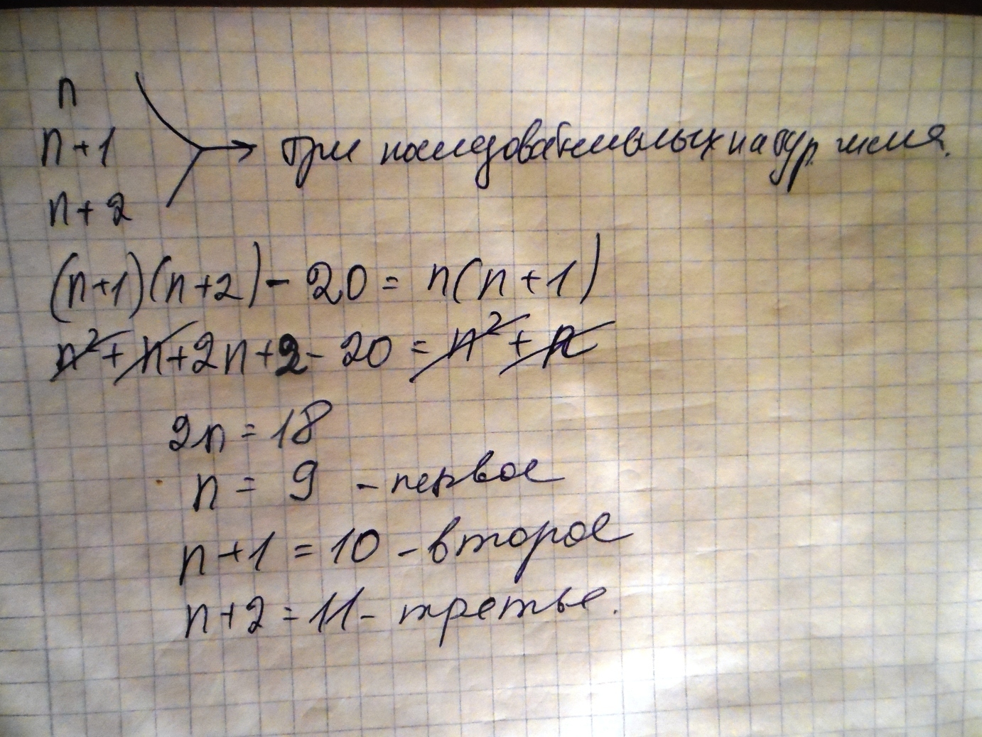 Даны три последовательных натуральных числа. Произведение двух больших чисел на 20 больше произведения двух меньших чисел. Найдите эти числа.