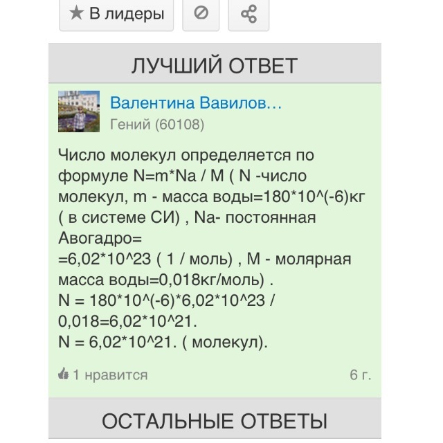 N(H2O)=n(H2O)+N(A)=0.01*6.02*10^23=6.02*10^21 молекул