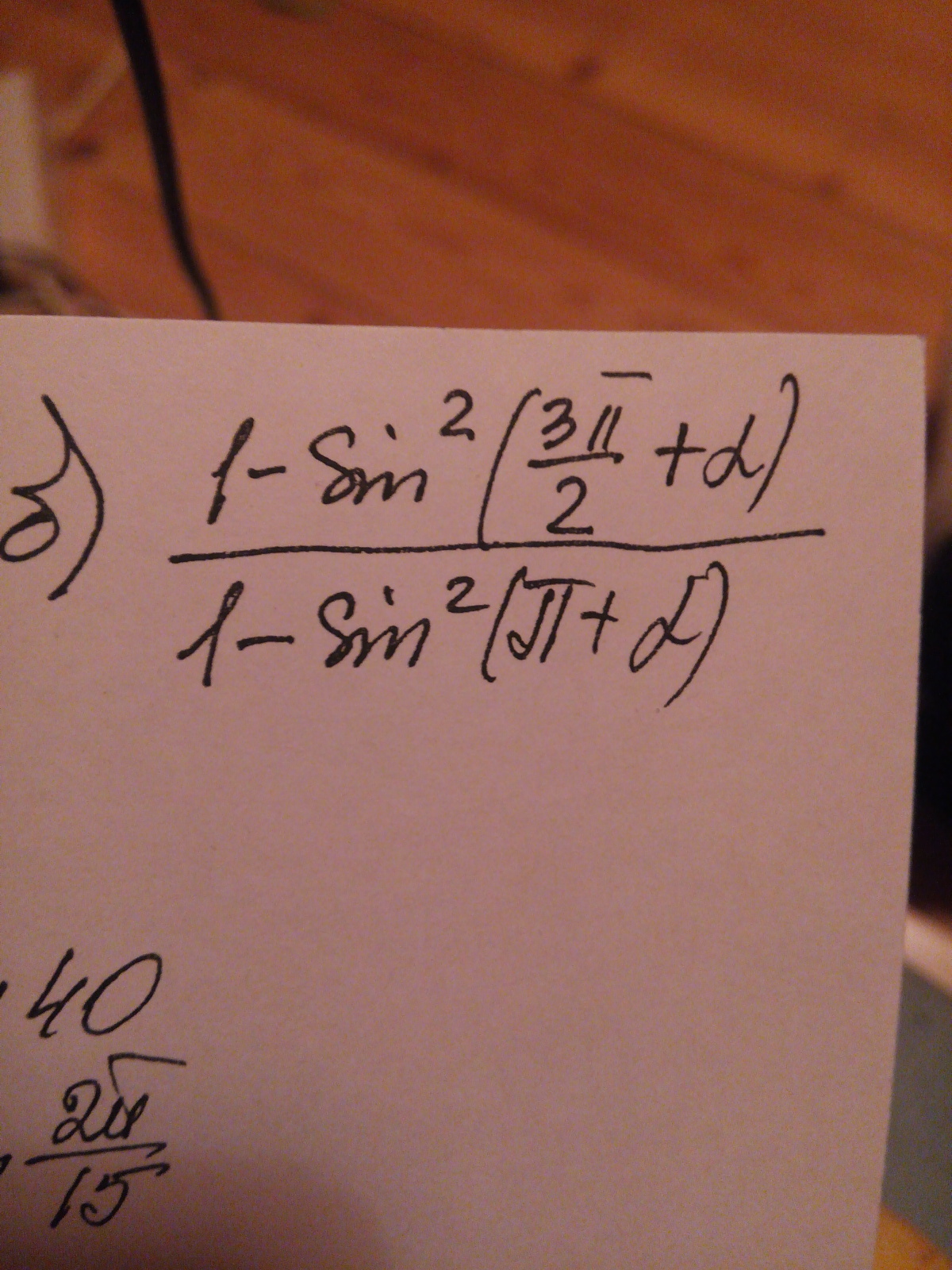 = (1-cos^2 α)/(1-sin^2 α) ( по формулам приведения; поскольку тригонометрические функции возведены в квадрат, мы не беспокоимся по поводу знаков, думаем только о том, когда синус меняется на косинус, а когда остается синусом) =
