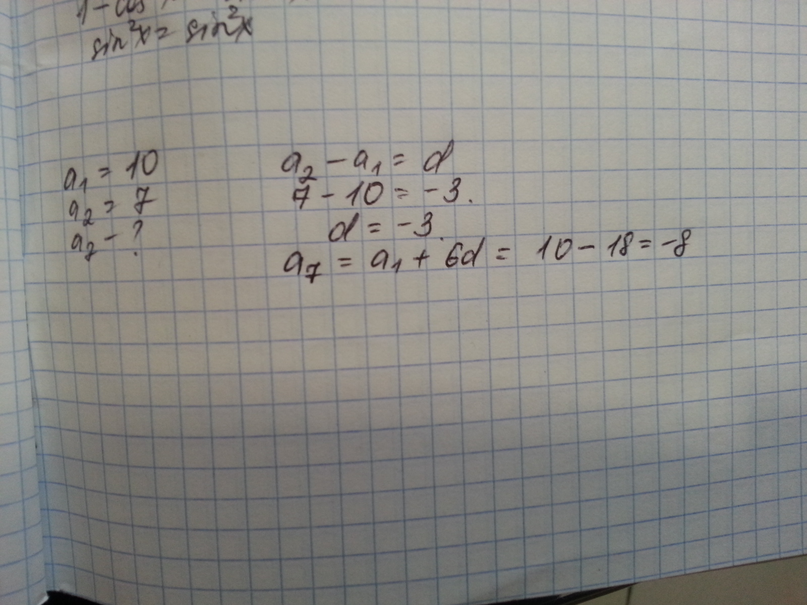 у арифметической прогрессии первое значение равно 10 второе 7. найдите седьмое значение