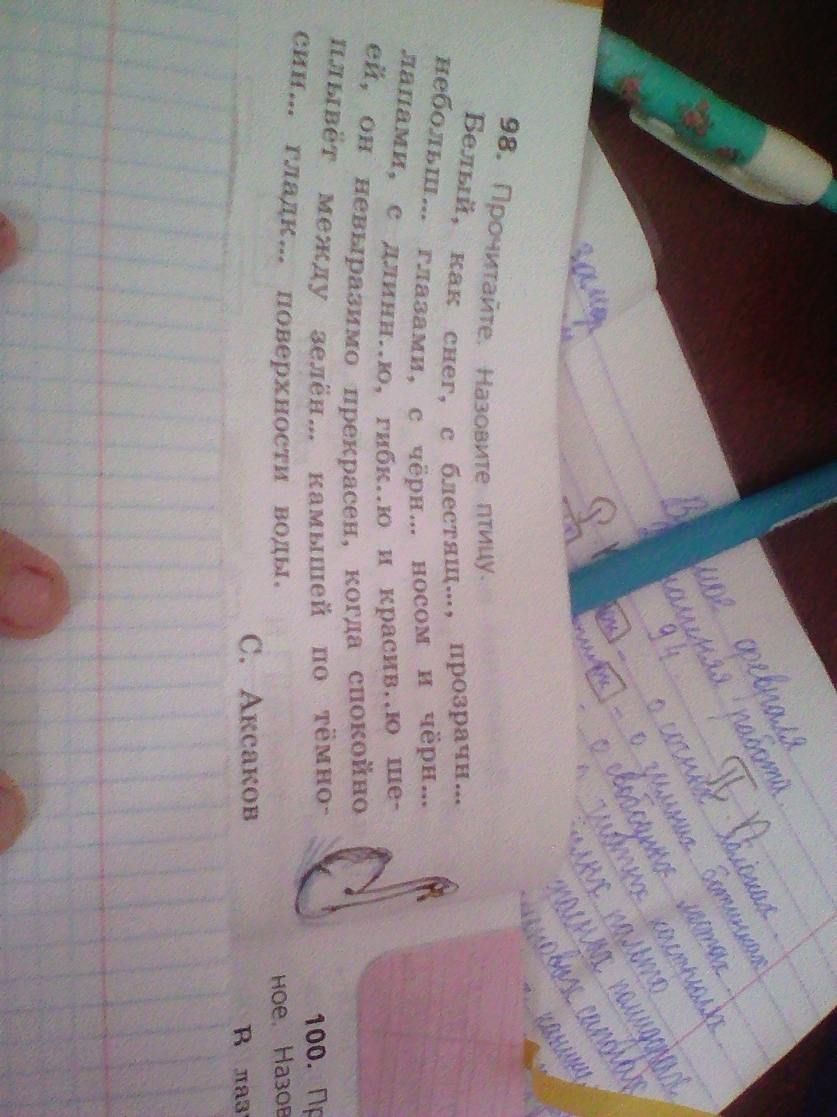 белый, как снег, с блестящими(Т.п), прозрачными (Т.п) небольшими(Т.п) глазами, с черным (Т.п) носом и с черными ( Т.п) лапами, с длинною(Т.п), гибкою(Т.п) и красивою (Т.п) шеей, он невыразимо прекрасен, когда спокойно плывет, между зеленых (Т.п) камышей по темно синей (Д.т.) гладкой (Т.п) поверхности воды.