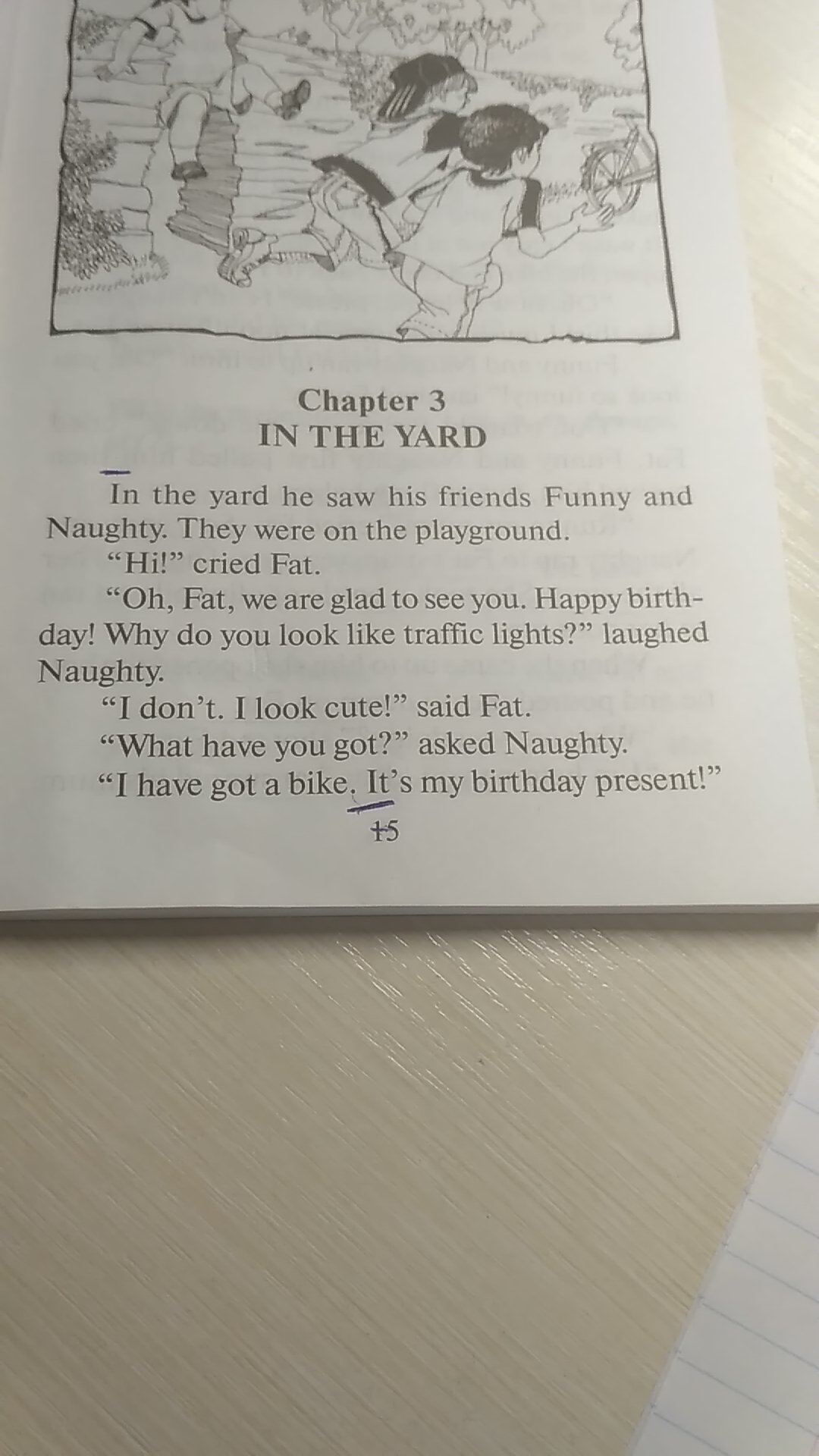 Во дворе он увидел своих друзей Фани и Найти. Они были на игровой площадке. Привет! - закричал Фэт. О, Фэт, мы рады видеть тебя. С днём рождения! Почему ты выглядишь как светофор? - засмеялась Найти. Нет, я выгляжу милым - сказал Фэт. Что у тебя? - спросила Найти. У меня велосипед. Это подарок на мой день рождения