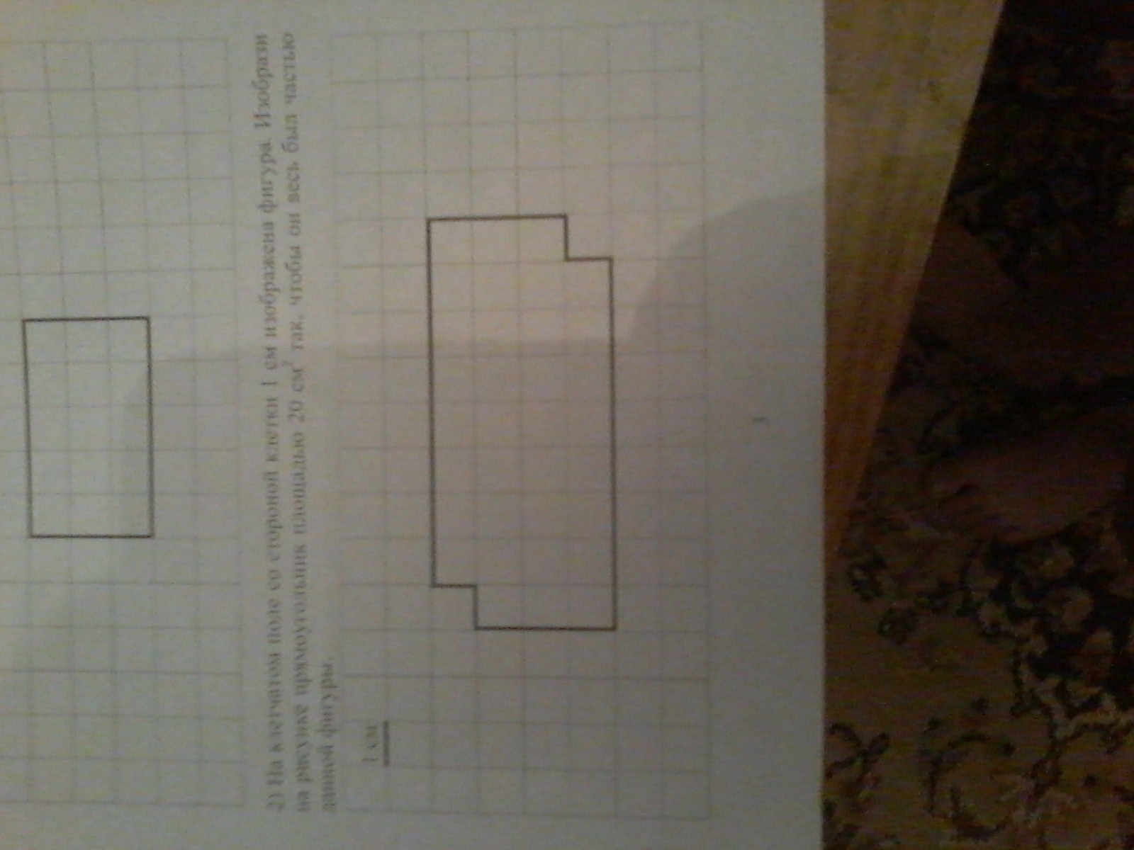 На клетчатом поле со стороной клетки 1 см изображена фигура. Изобрази на рисунке прямоугольник площадью 20 см квадратных так, чтобы он весь был частью данной фигуры.