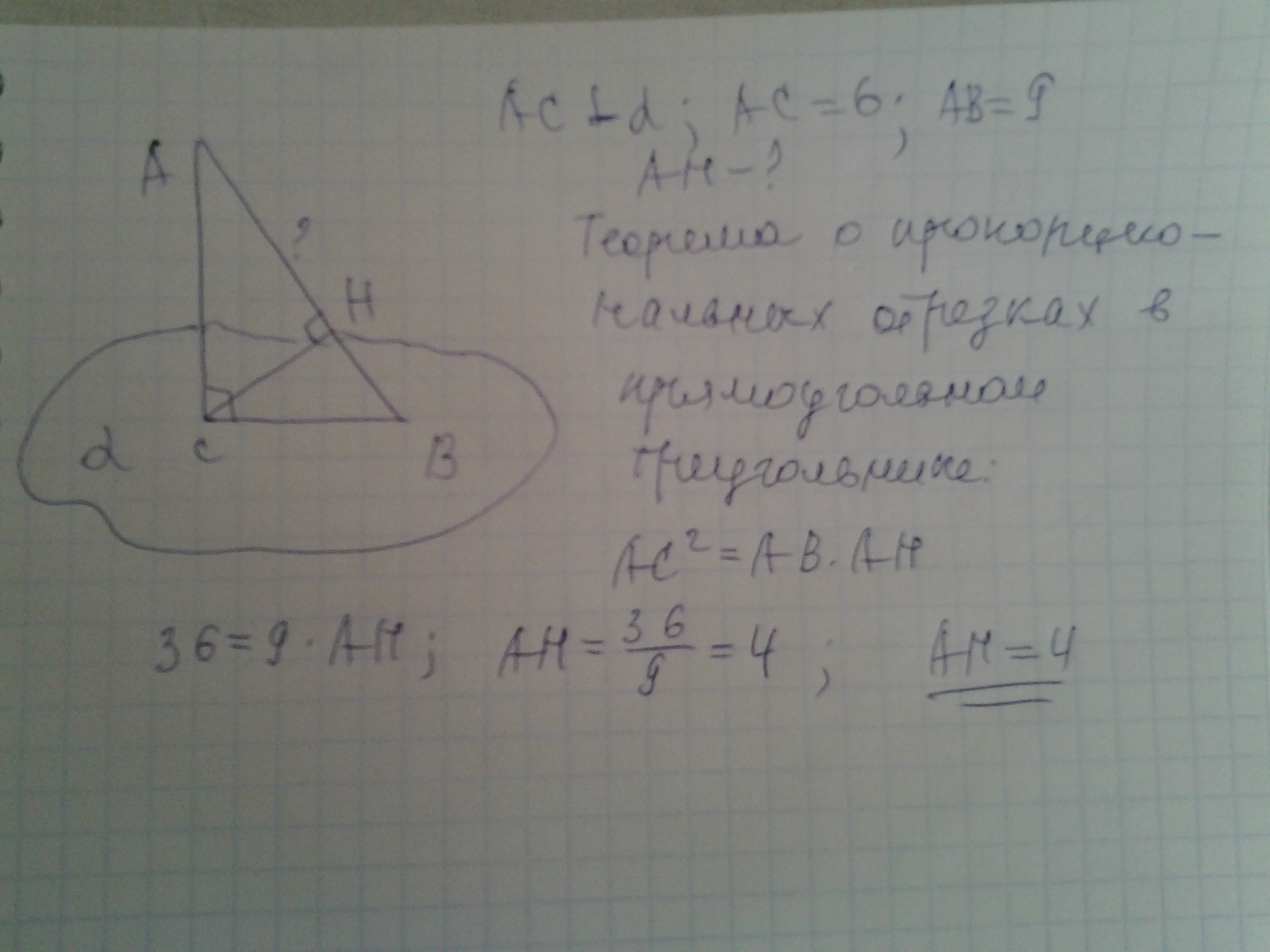 Із точки поза даною площиною проведено до неї перпендикуляр довжиною 6 см і похилу 9 см . Знайдіть довжину проекції перпендикуляра на похилую