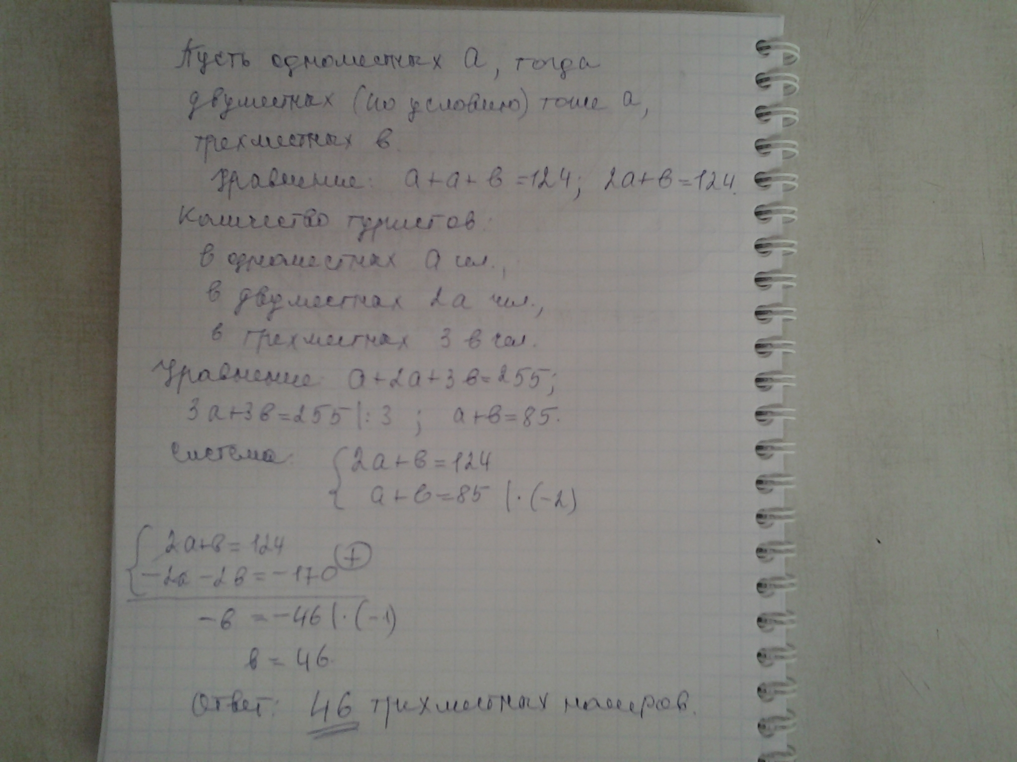 У готелі для проживання туристів є одномісні, двомісні та тримісні номери. Їх всього 124. Якщо всі номери в готелі заповненні, то одночасно в ньому проживає 255 туристів. Скільки всього в цьому тримісних номерів, якщо одномісних номерів дорівнює кількості двоміних номерів?