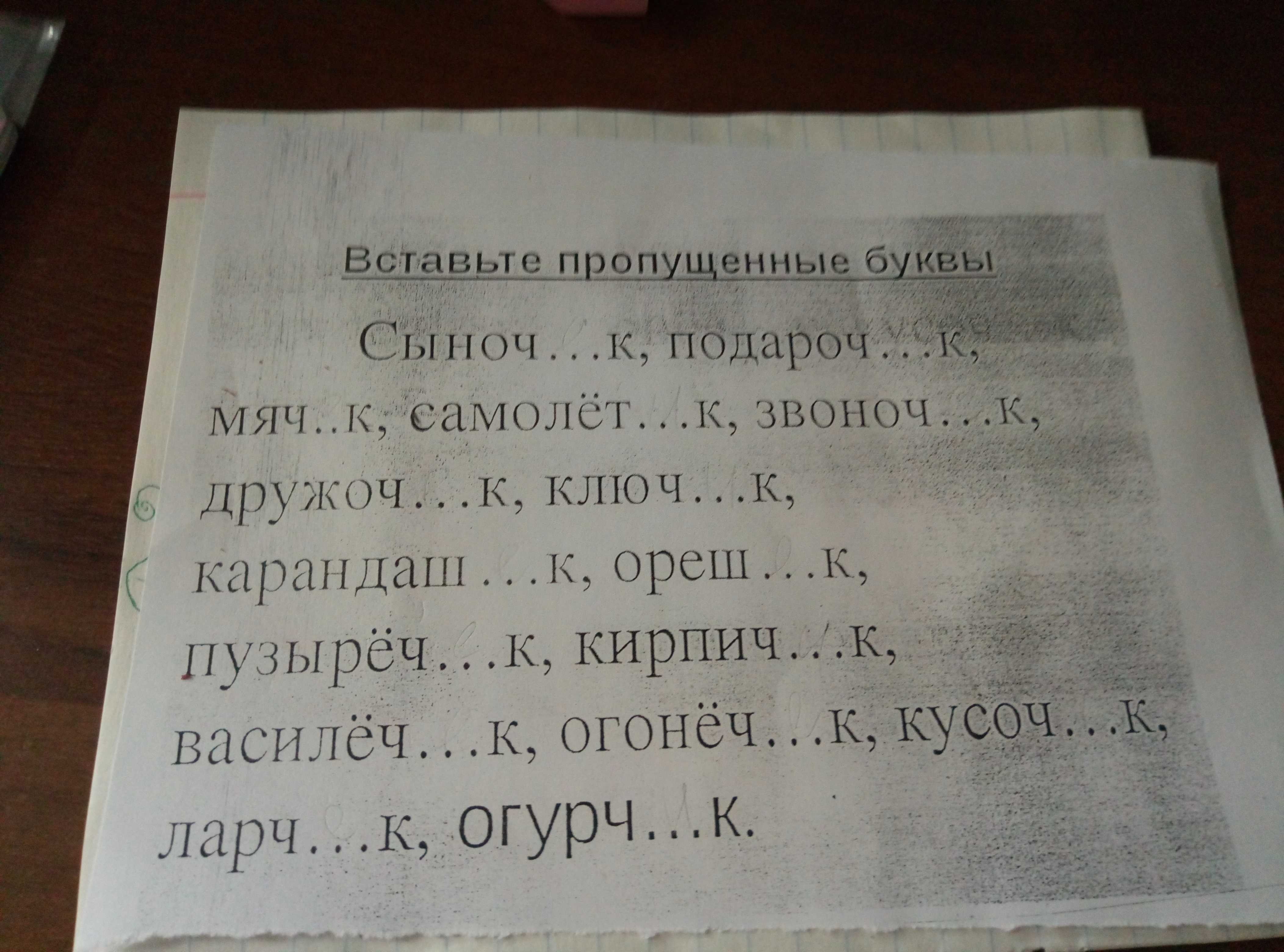Сыночек,подарочек,мячик,самолетик,звоночек,дружочек,ключик,карандашик,орешек,пузыречек,кирпичик,василечек.огонечек,кусочек,ларчик,огуречик