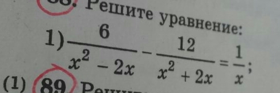 dfrac{6}{x^2-2x}- dfrac{12}{x^2+2x}= dfrac{1}{x} \  dfrac{6}{x(x-2)}- dfrac{12}{x(x+2)}- dfrac{1}{x}=0 \  dfrac{6x+12-12x+24-x^2+4}{x(x+2)(x-2)}=0 \ -x^2-6x+40=0 \ x^2+6x-40=0 \ x_1+x_2=-6 \ x_1x_2=-40 \ x_1=-10 \ x_2=4