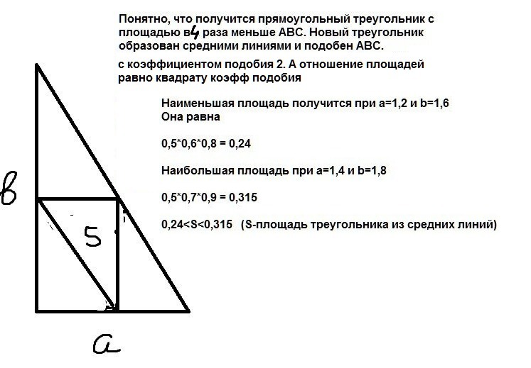 В прямоугольном треугольнике ABC с катетами ,равными а (см) , b (см) , соединили последовательно середины сторон. Оцените площадь образовавшегося треугольника , если 1,2<a<1,4 ; 1,6<b<1,8