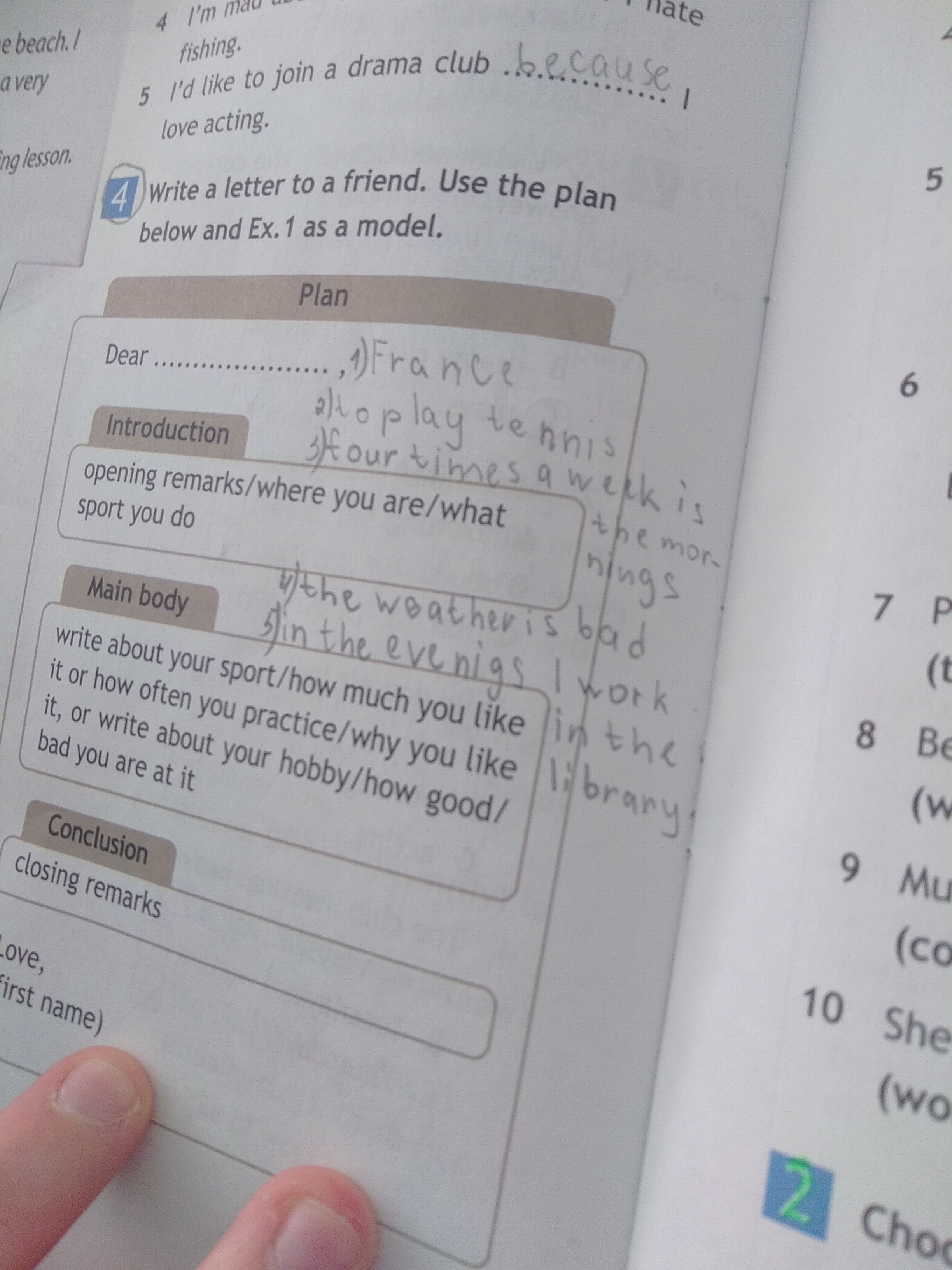 I'm living in France.I go in the Sport center and play tennis.This sport is very interesting.I go in this centre about 10-20 minutes, four times a week in the morning.In the evenings I go to the library.I'm practice now on new beats.This is my hobby.In tennis sport I find new friends.