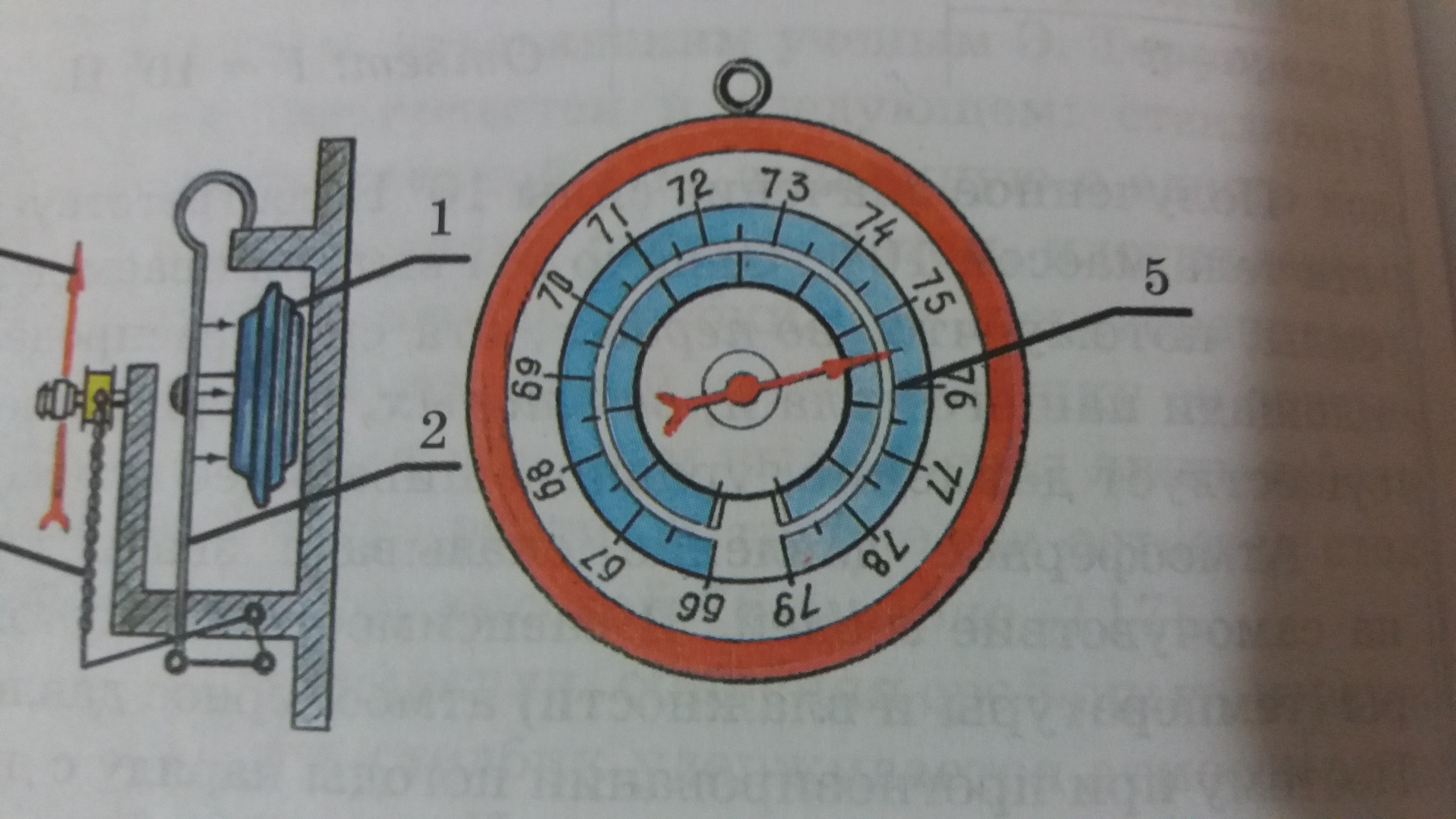 Градируеься в мм.рт.ст, а иногда в Паскалях (10^3 Па). Цена деления 10 мм.рт.ст. Показание прибора 755 мм.рт.ст