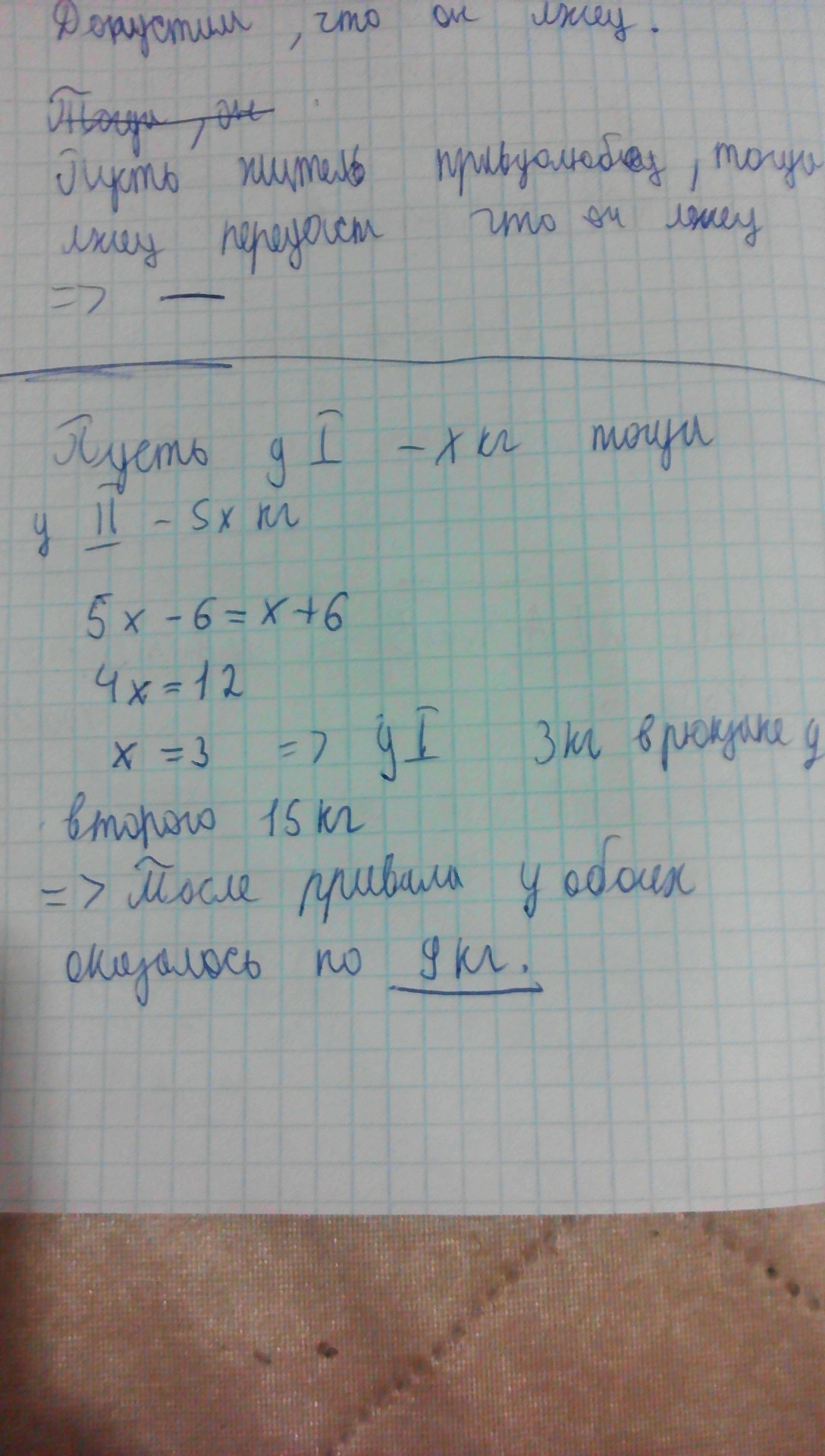 После привала в рюкзаке у одного из туристов оказалось в 5 раз больше продуктов чем у другого.Для того чтобы уравнять груз,6 кг продуктов из его рюкзака переложили в рюкзак второго туриста.Сколько кг продуктов оказалось в рюкзаках каждого из туристов после привала до перекладывания?