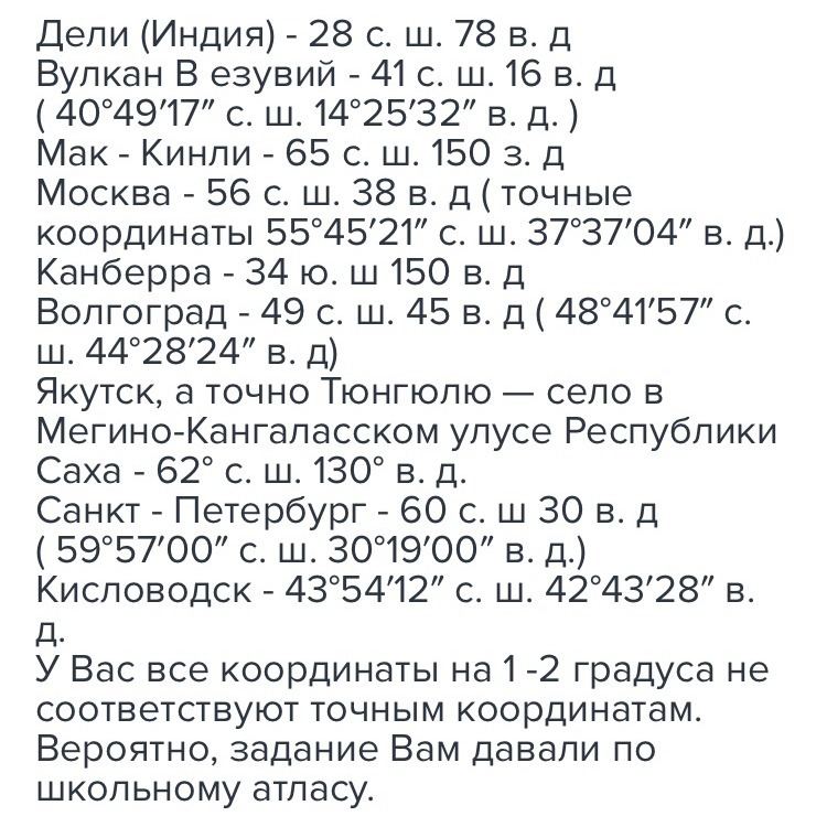 У Вас все координаты на 1 -2 градуса не соответствуют точным координатам. Вероятно, задание Вам давали по школьному атласу.