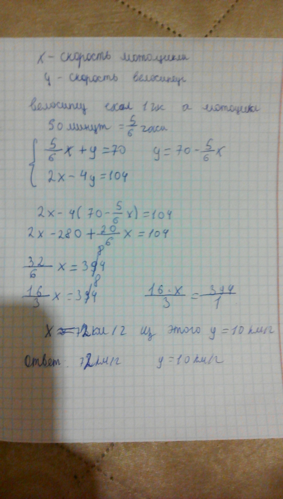 Из пункта A в пункт B, расстояние между которыми 70 км, выехал мотоциклист. За 10 минут до этого навстречу ему выехал велосипедист, который встретился с ним через 1 час после своего отъезда. Найти скорость каждого, если мотоциклист за 2 часа проезжает на 104 км больше чем велосипедист за 4 часа. Решить только через уравнение с 2 неизвестными( x,y)