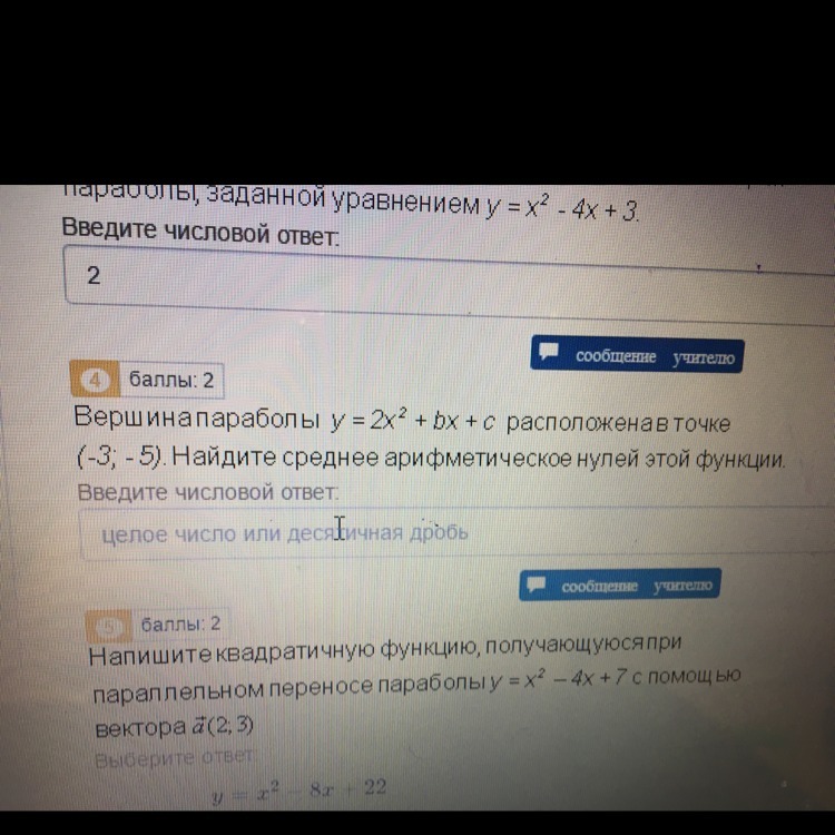 Вершина параболы у= 2 х^2 + bx +c расположена в точке (-3;-5) . Найдите среднее арифметическое нулей этой функции