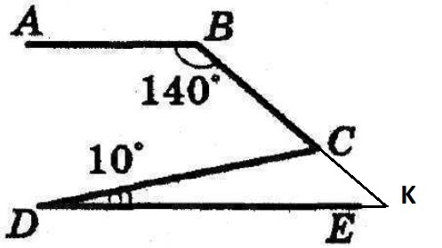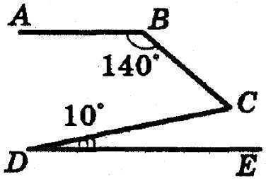 На рисунке АВ||DE. Найдите угол BCD, если ∠ABC = 140˚, ∠CDE = 10˚.