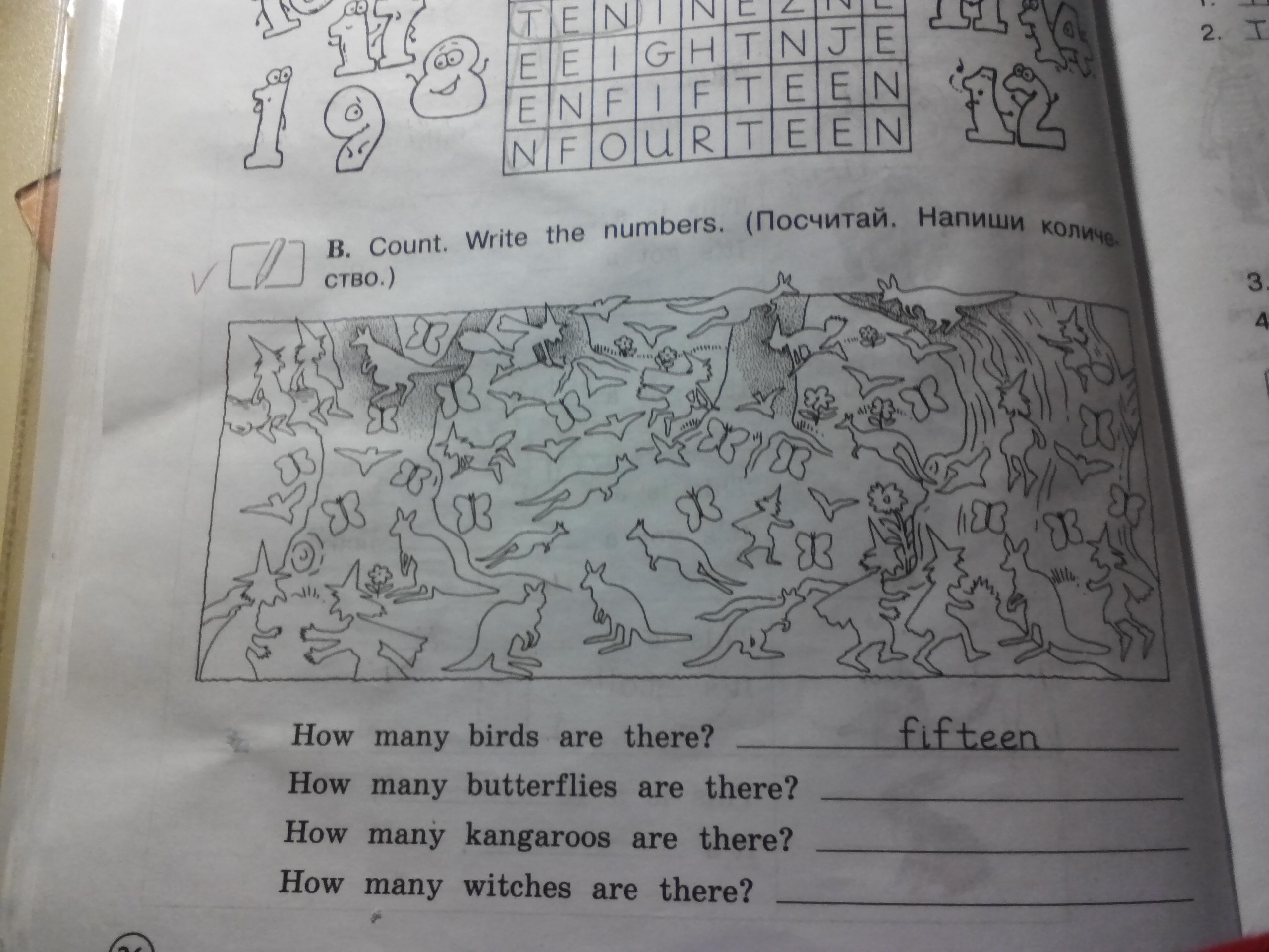 17 бабочек, 11 кенгуру, 14 ведьм (seventeen butterflies, eleven kangaroos, fourtien witches) я могу сделать ошибку.