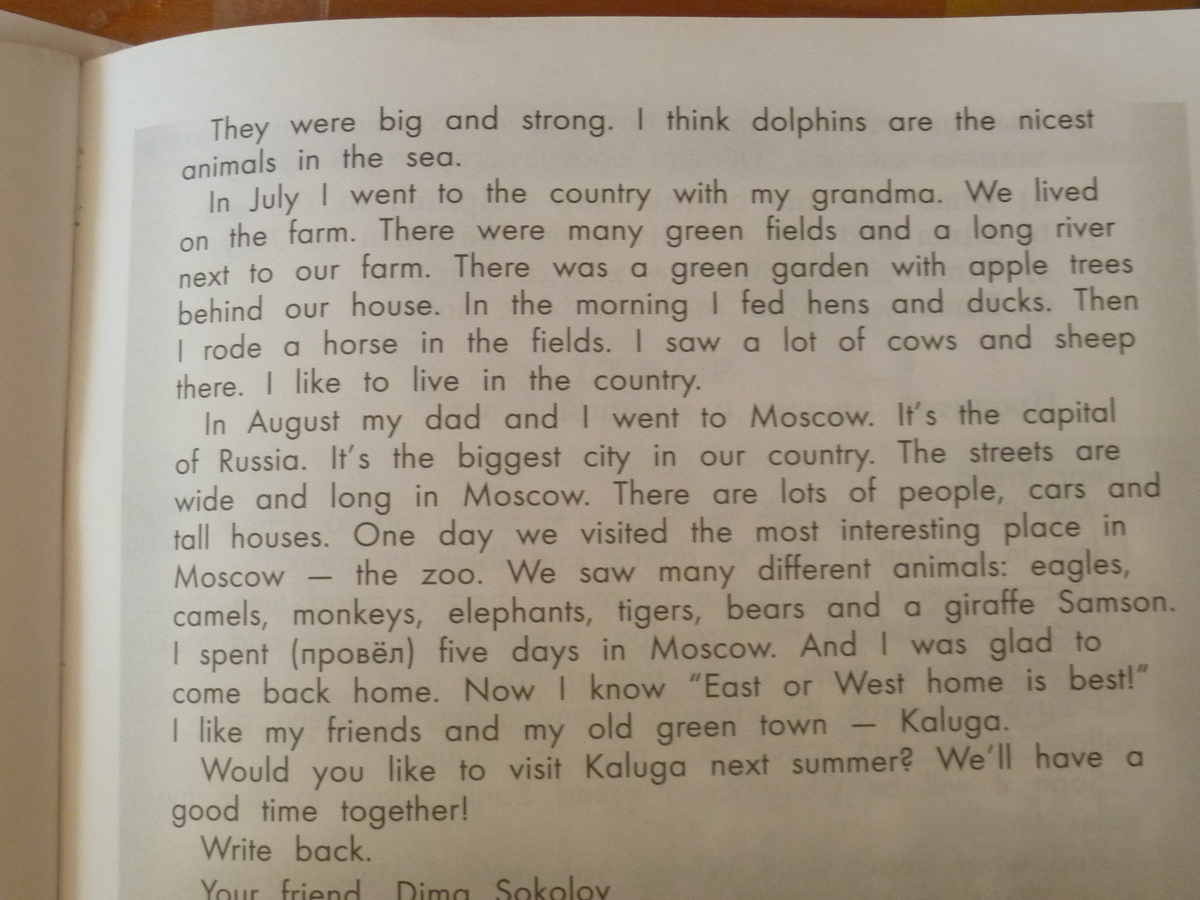 В августе я со своим папой ездил в Москву. Это столица России. Это самый большой город нашей страны. В Москве улицы широкие и длинные. Там много людей, машин, и высоких домов. В один из дней мы посетили самое интересное место в Москве - зоопарк. Мы видели много различных животных: орлов, верблюдов, обезьян, слонов, тигров, медведей и жирафа Самсона. В Москве я провел 5 дней. И я был рад снова вернуться домой. Теперь я знач, сто "В гостях хорошо, а дома лучше". Я люблю своих друзей и старый зеленый город Калуга. Вы не хотите приехать следующим летом в Калугу? Мы хорошо проведем время вместе! Напиши ответ.