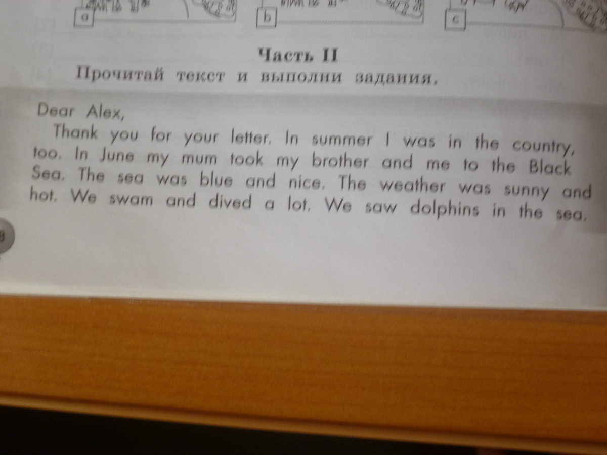 Спасибо за твое письмо. Я то же был в деревне. В июне моя мама взяла меня и моего брат на Черное море. Мы много плавали и ныряли. Мы видели дельфинов в море