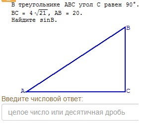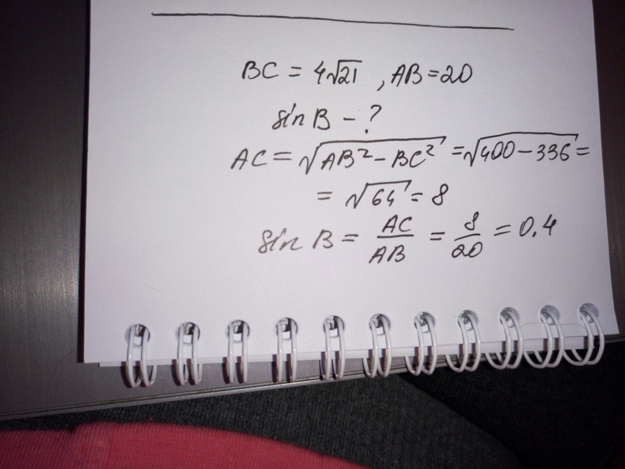 используя теорему Пифагора, находим противолежащий углу B катет, затем по определению синуса ищем его. ответ 0.4