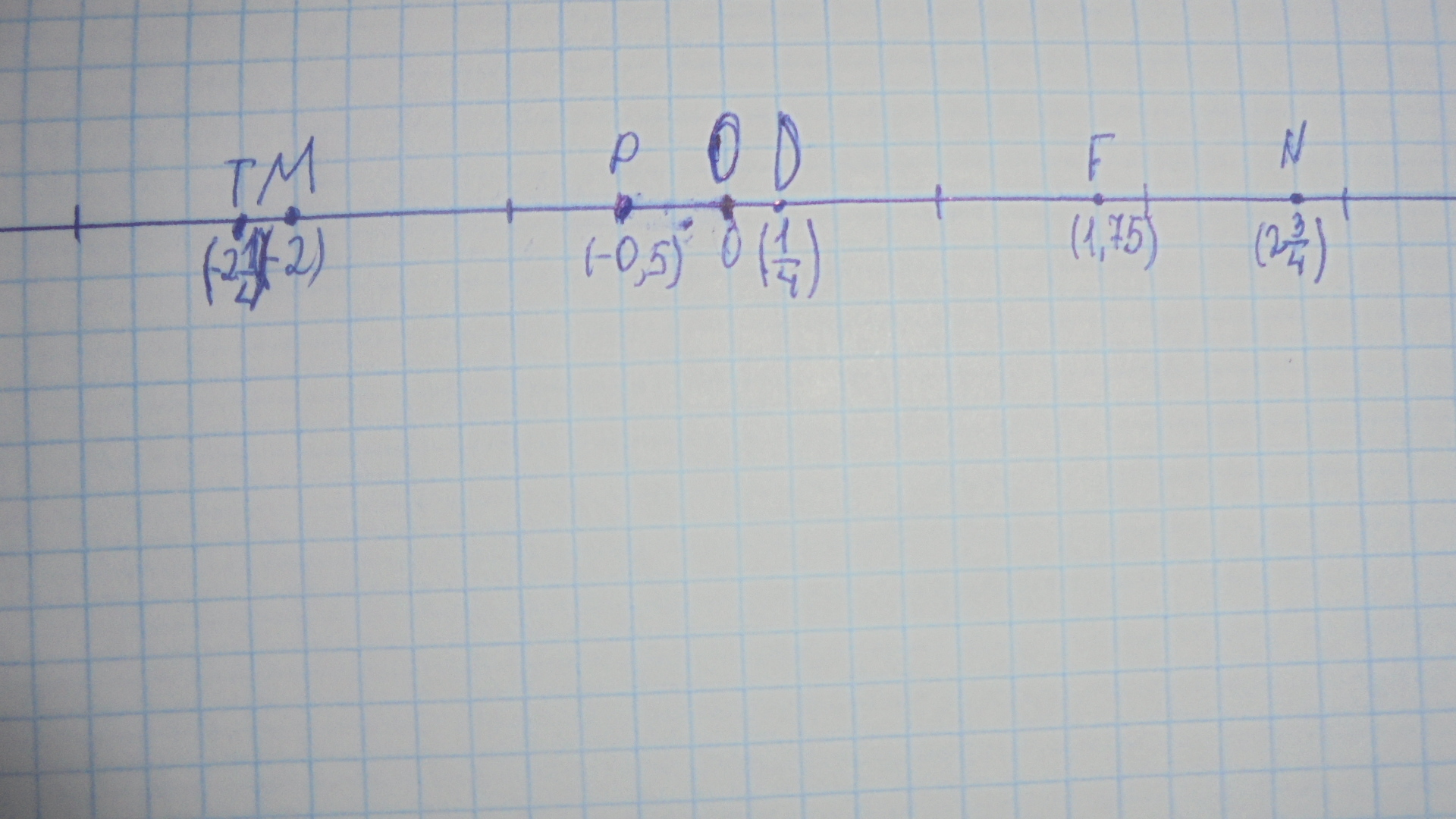 Начертите координатную прямую,взяв за единичный такой отрезок,длина которого в 4 раза больше стороны клетки тетради.Отметьте точки M (-2) P (-0,5) F (1,75) D (1/4) S (1 /2) N ( 2 3/4) T (-2 1/4)