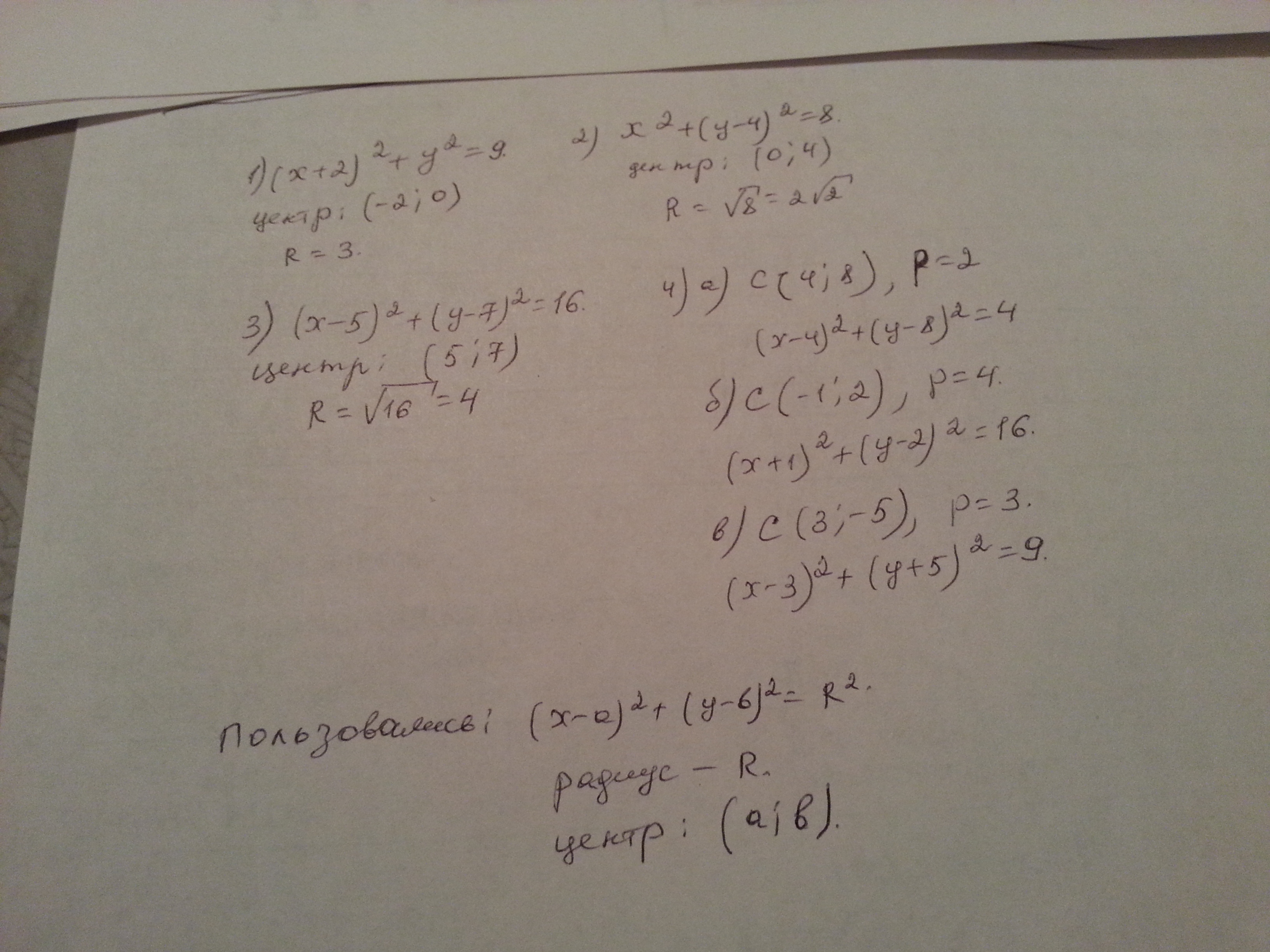 Составьте уравнение окружности с центром в точке С и радиусом Р если а) С (4;8) Р=2 б) с (-1:2) р=4 в) С(3:-5) р =3