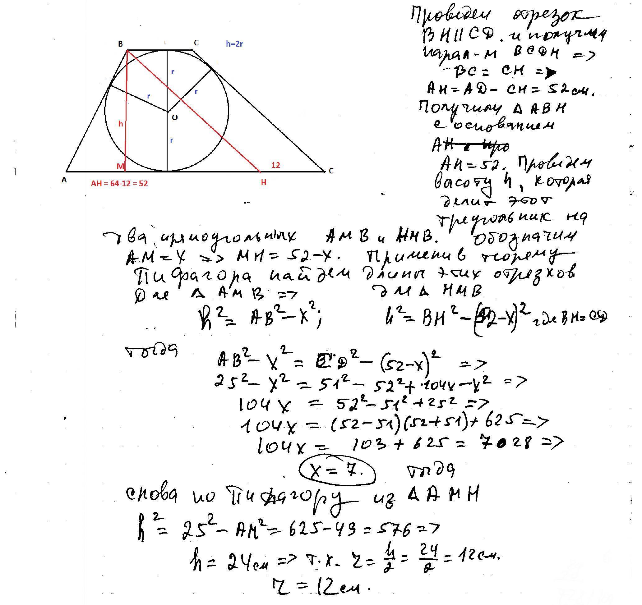 Найдите радиус окружности, вписанной в трапецию, у которой боковые стороны равны 25 и 51, а длина одного из оснований равна 64. Если ответ не целый, округлите его вниз до ближайшего целого.