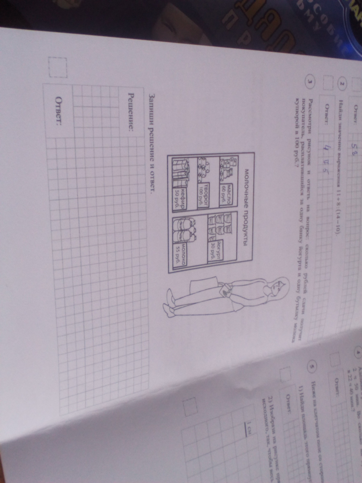 рассмотри рисунок и ответь на вопрос:сколько рублейсдачи получит покупатель расплатившийся за однубанку йогурта и одну бутылку молока купюрой в 100 рубле