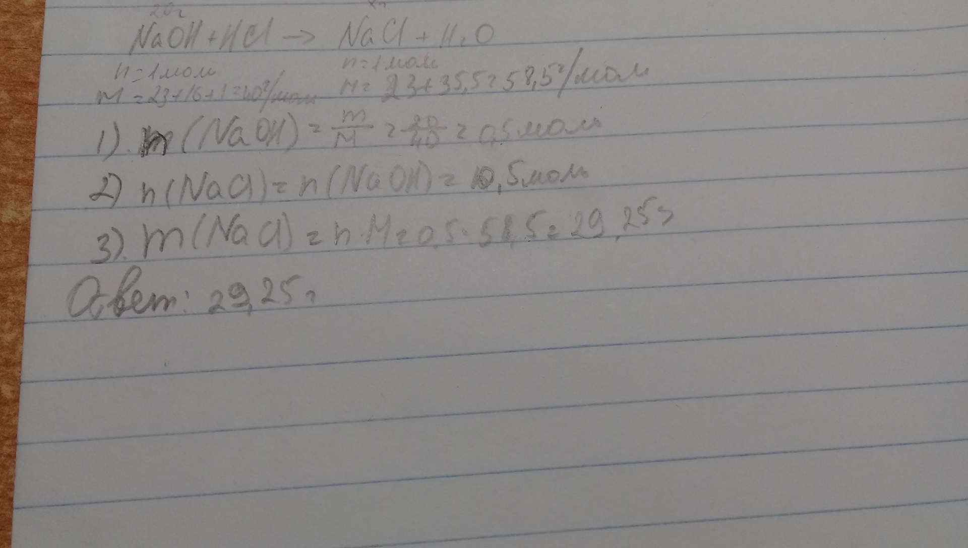 Какая масса хлорида натрия получится при взаимодействии 20г гидроксида натрия с соляной кислотой ?