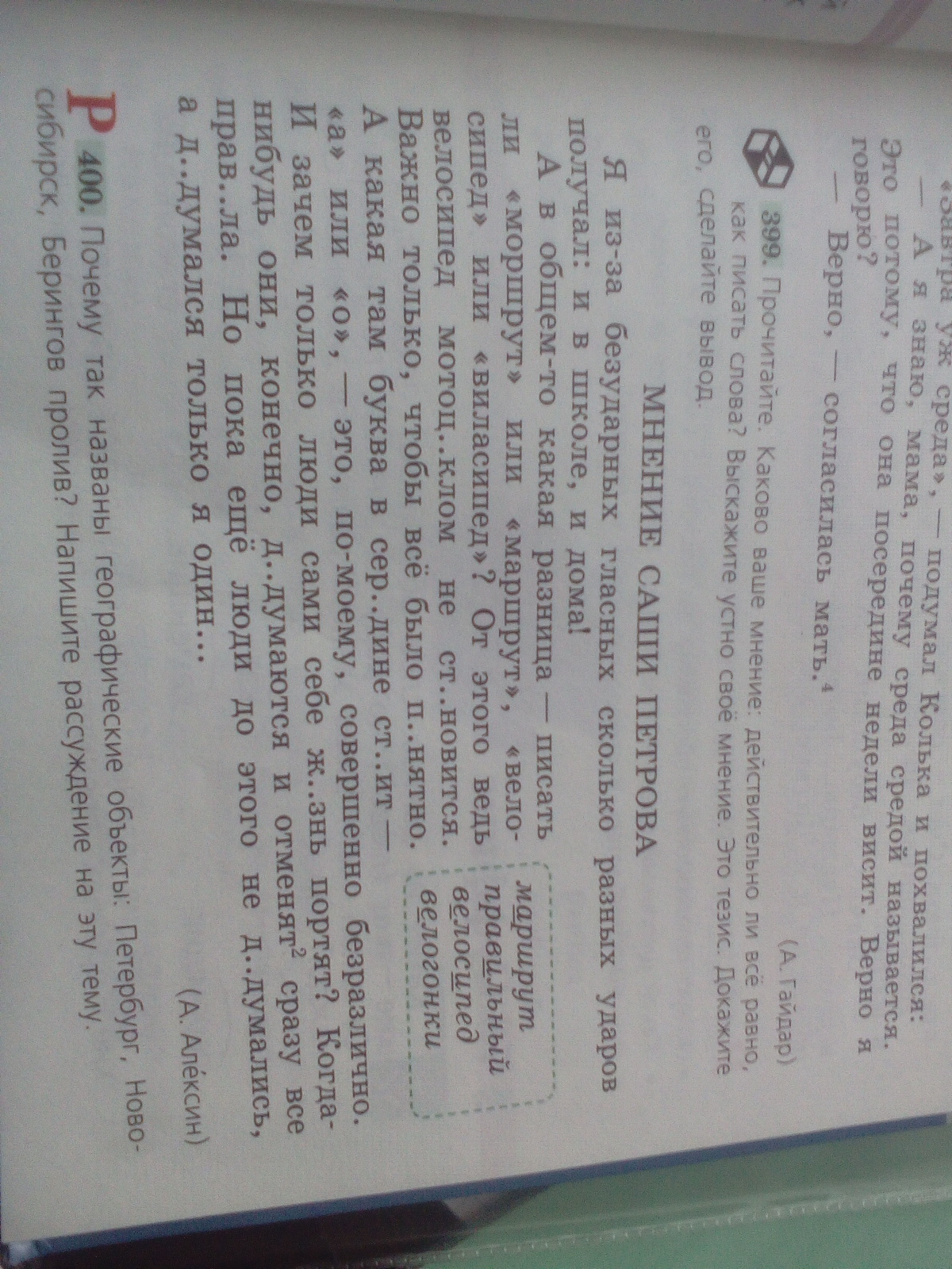 Лично я думаю, что Саша Петров неправильно думает о безударных гласных,ведь они нужны не только школьникам, но и взрослым.