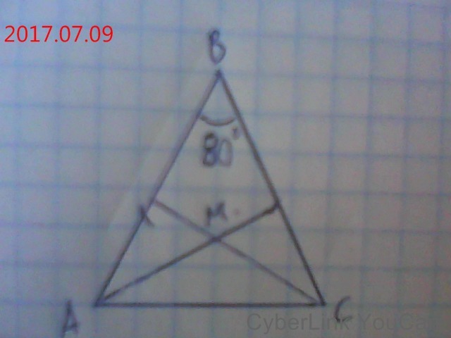 В треугольнике A B C, АB=BC, <B= 80градусов, биссектрисы углов А и С пересекаются в точке М, найдите угол А М С?
