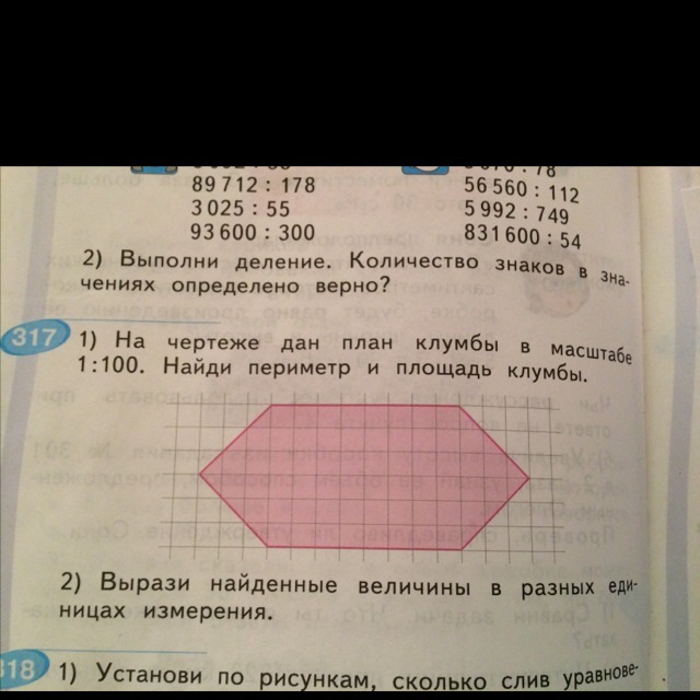 На чертеже две план клумбы в масштабе 1:100. Найди периметр и площадь клумбы.